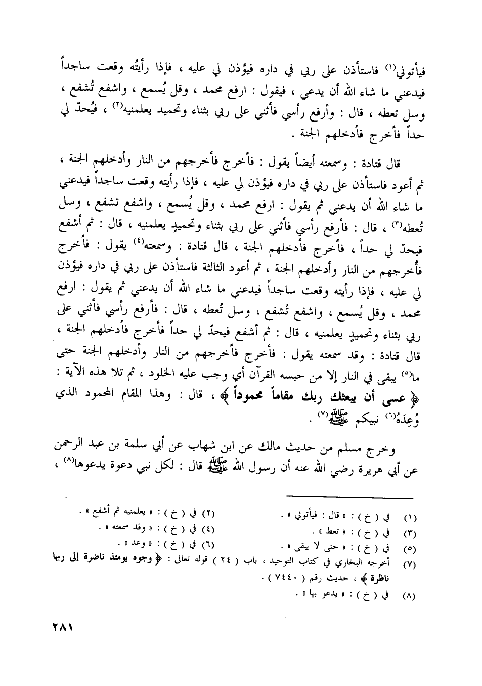 قال قتادة: وسمعته أيضا يقول: فأخرج فأخرجهم من النار وأدخلهم الجنة، ثم أعود فاستأذن على ربي في داره فيؤذن لي عليه، فإذا رأيته وقعت ساجدا فيدعني ما شاء اللَّه أن يدعني ثم يقول: ارفع محمد، وقل يسمع، واشفع تشفع، وسل تعطه [ (3) ] ، قال: فأرفع رأسي فأثني على ربي بثناء وتحميد يعلمنيه، قال: ثم أشفع فيحدّ لي حدا، فأخرج فأدخلهم الجنة، قال قتادة: وسمعته [ (4) ] يقول: فأخرج فأخرجهم من النار وأدخلهم الجنة، ثم أعود الثالثة فاستأذن على ربي في داره فيؤذن لي عليه، فإذا رأيته وقعت ساجدا فيدعني ما شاء اللَّه أن يدعني ثم يقول: ارفع محمد، وقل يسمع، واشفع تشفع، وسل تعطه، قال: فأرفع رأسي فأثني على ربي بثناء وتحميد يعلمنيه، قال: ثم أشفع فيحدّ لي حدا فأخرج فأدخلهم الجنة، قال قتادة: وقد سمعته يقول: فأخرج فأخرجهم من النار وأدخلهم الجنة حتى ما [ (5) ] يبقى في النار إلا من حبسه القرآن أي وجب عليه الخلود، ثم تلا هذه الآية:
