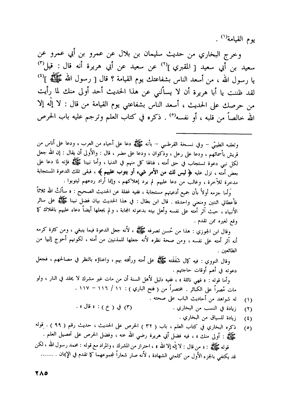 وخرج البخاري من حديث سليمان بن بلال عن عمرو بن أبي عمرو عن سعيد بن أبي سعيد [المقبري] [ (2) ] عن سعيد عن أبي هريرة أنه قال: قيل [ (3) ] يا رسول اللَّه، من أسعد الناس بشفاعتك يوم القيامة؟ قال [رسول اللَّه صلى اللَّه عليه وسلّم] [ (4) ] لقد ظننت يا أبا هريرة أن لا يسألني عن هذا الحديث أحد أولى منك لما رأيت من حرصك على الحديث، أسعد الناس بشفاعتي يوم القيامة من قال: لا إله إلا اللَّه خالصا من قلبه، أو نفسه [ (5) ] . ذكره في كتاب العلم وترجم عليه باب الحرص