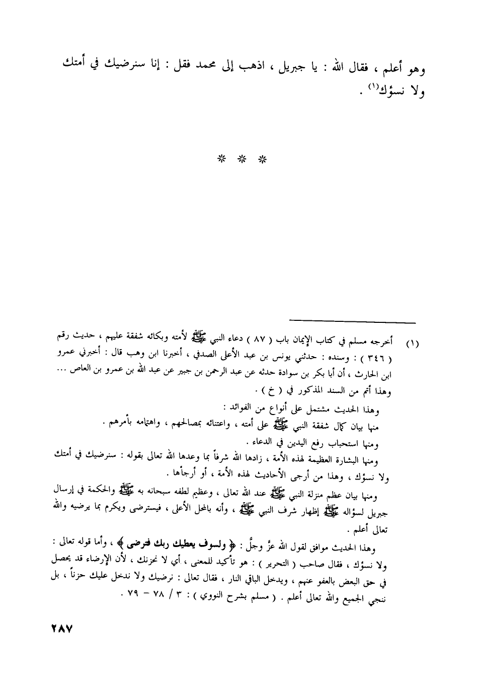 ومنها البشارة العظيمة لهذه الأمة، زادها اللَّه شرفا بما وعدها اللَّه تعالى بقوله: سنرضيك في أمتك ولا نسؤك، وهذا من أرجى الأحاديث لهذه الأمة، أو أرجأها.