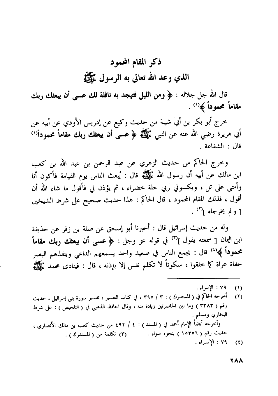 [ (2) ] أخرجه الحاكم في (المستدرك) : 3/ 395، في كتاب التفسير، تفسير سورة بني إسرائيل، حديث رقم (3383) وما بين الحاصرتين زيادة منه، وقال الحافظ الذهبي في (التلخيص) : على شرط البخاري ومسلم.