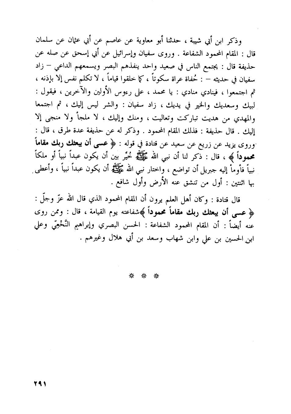 عَسى أَنْ يَبْعَثَكَ رَبُّكَ مَقاماً مَحْمُوداً شفاعته يوم القيامة، قال: وممن روى عنه أيضا: أن المقام المحمود الشفاعة: الحسن البصري وإبراهيم النّخعيّ وعلي ابن الحسين بن علي وابن شهاب وسعد بن أبي هلال وغيرهم.