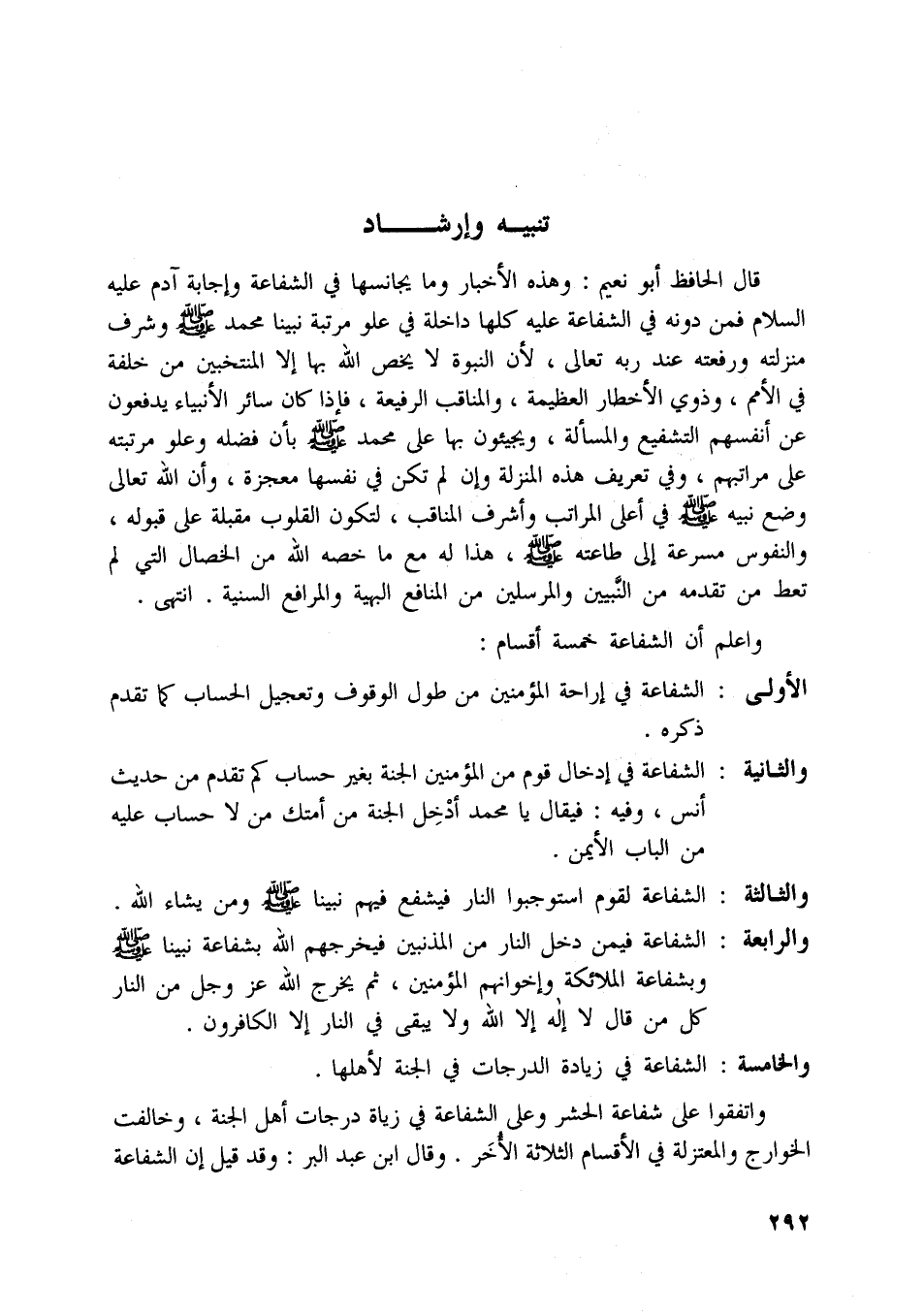 واتفقوا على شفاعة الحشر وعلى الشفاعة في زيادة درجات أهل الجنة، وخالفت الخوارج والمعتزلة في الأقسام الثلاثة الأخر. وقال ابن عبد البر: وقد قيل إن الشفاعة