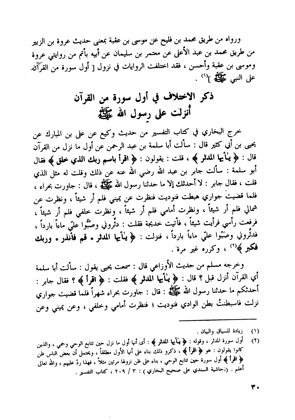 خرج البخاري في كتاب التفسير من حديث وكيع عن على بن المبارك عن يحيى بن أبي كثير قال: سألت أبا سلمة بن عبد الرحمن عن أول ما نزل من القرآن قال: يا أَيُّهَا الْمُدَّثِّرُ، قلت: يقولون: اقْرَأْ بِاسْمِ رَبِّكَ الَّذِي خَلَقَ فقال أبو سلمة: سألت جابر بن عبد اللَّه رضي اللَّه عنه عن ذلك وقلت له مثل الّذي قلت، فقال جابر: لا أحدثك إلا ما حدثنا رسول اللَّه صلّى اللَّه عليه وسلّم، قال: جاورت بحراء، فلما قضيت جواري هبطت فنوديت فنظرت عن يميني فلم أر شيئا، ونظرت عن شمالي فلم أر شيئا، ونظرت أمامي فلم أر شيئا، ونظرت خلفي فلم أر شيئا، فرفعت رأسي فرأيت شيئا، فأتيت خديجة فقلت: دثّروني وصبّوا عليّ ماء باردا، فدثّروني وصبّوا عليّ ماء باردا، فنزلت: يا أَيُّهَا الْمُدَّثِّرُ* قُمْ فَأَنْذِرْ* وَرَبَّكَ فَكَبِّرْ [ (2) ] ، وكرره غير مرة.
