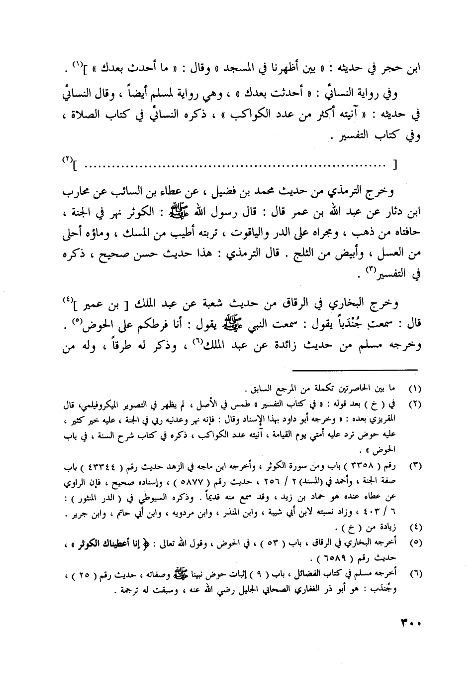 [ (2) ] في (خ) بعد قوله: «في كتاب التفسير» طمس في الأصل، لم يظهر في التصوير الميكروفيلم، قال المقريزي بعده: «وخرجه أبو داود بهذا الإسناد وقال: فإنه نهر وعدنيه ربي في الجنة، عليه خير كثير، عليه حوض ترد عليه أمتي يوم القيامة، آنيته عدد الكواكب، ذكره في كتاب شرح السنة، في باب الحوض» .