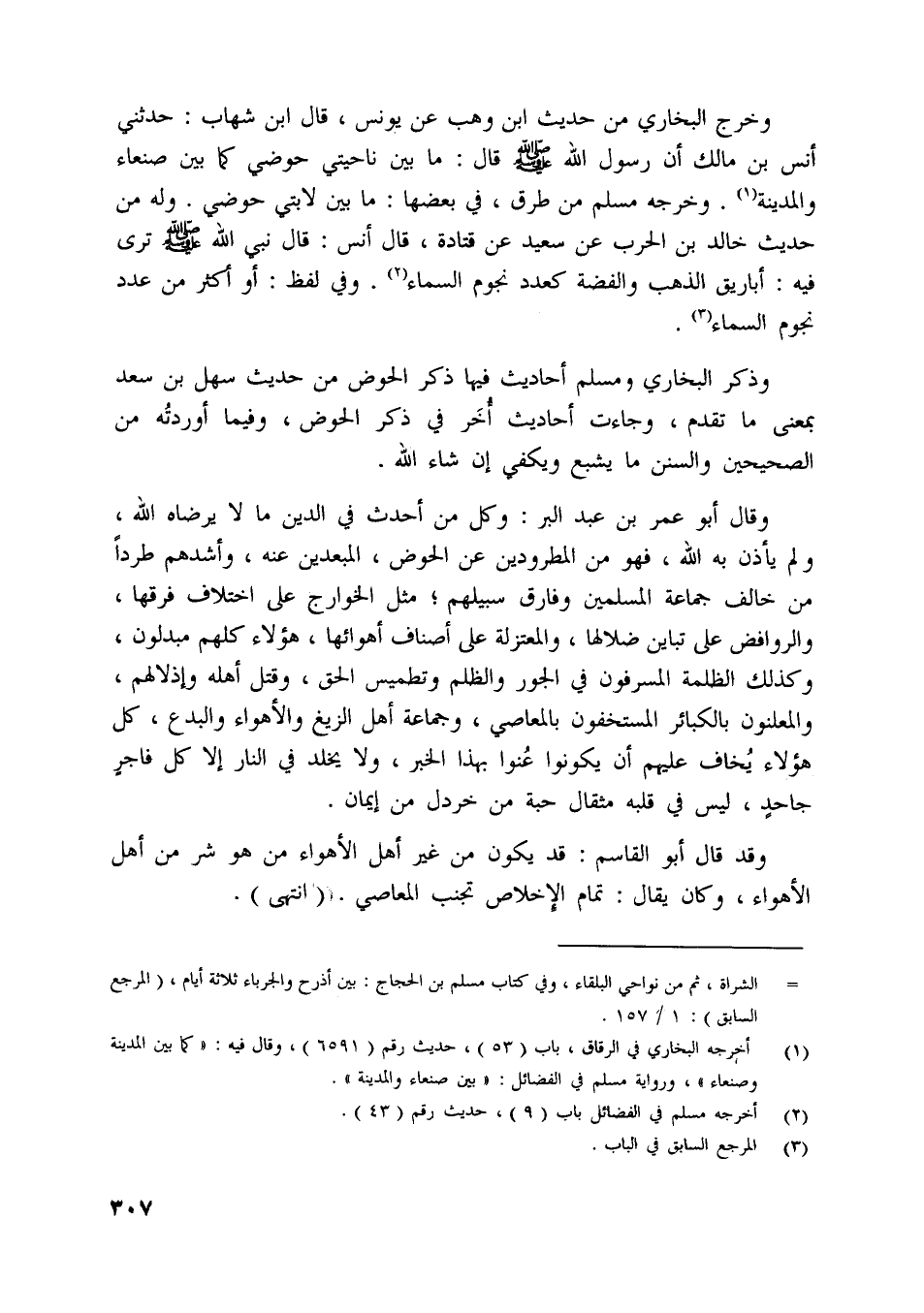 وقال أبو عمر بن عبد البر: وكل من أحدث في الدين ما لا يرضاه اللَّه، ولم يأذن به اللَّه، فهو من المطرودين عن الحوض، المبعدين عنه، وأشدهم طردا من خالف جماعة المسلمين وفارق سبيلهم، مثل الخوارج على اختلاف فرقها، والروافض على تباين ضلالها، والمعتزلة على أصناف أهوائها، هؤلاء كلهم مبدلون، وكذلك الظلمة المسرفون في الجور والظلم وتطميس الحق، وقتل أهله وإذلالهم، والمعلنون بالكبائر المستخفون بالمعاصي، وجماعة أهل الزيغ والأهواء والبدع، كل هؤلاء يخاف عليهم أن يكونوا عنوا بهذا الخبر، ولا يخلد في النار إلا كل فاجر جاحد، ليس في قلبه مثقال حبة من خردل من إيمان.