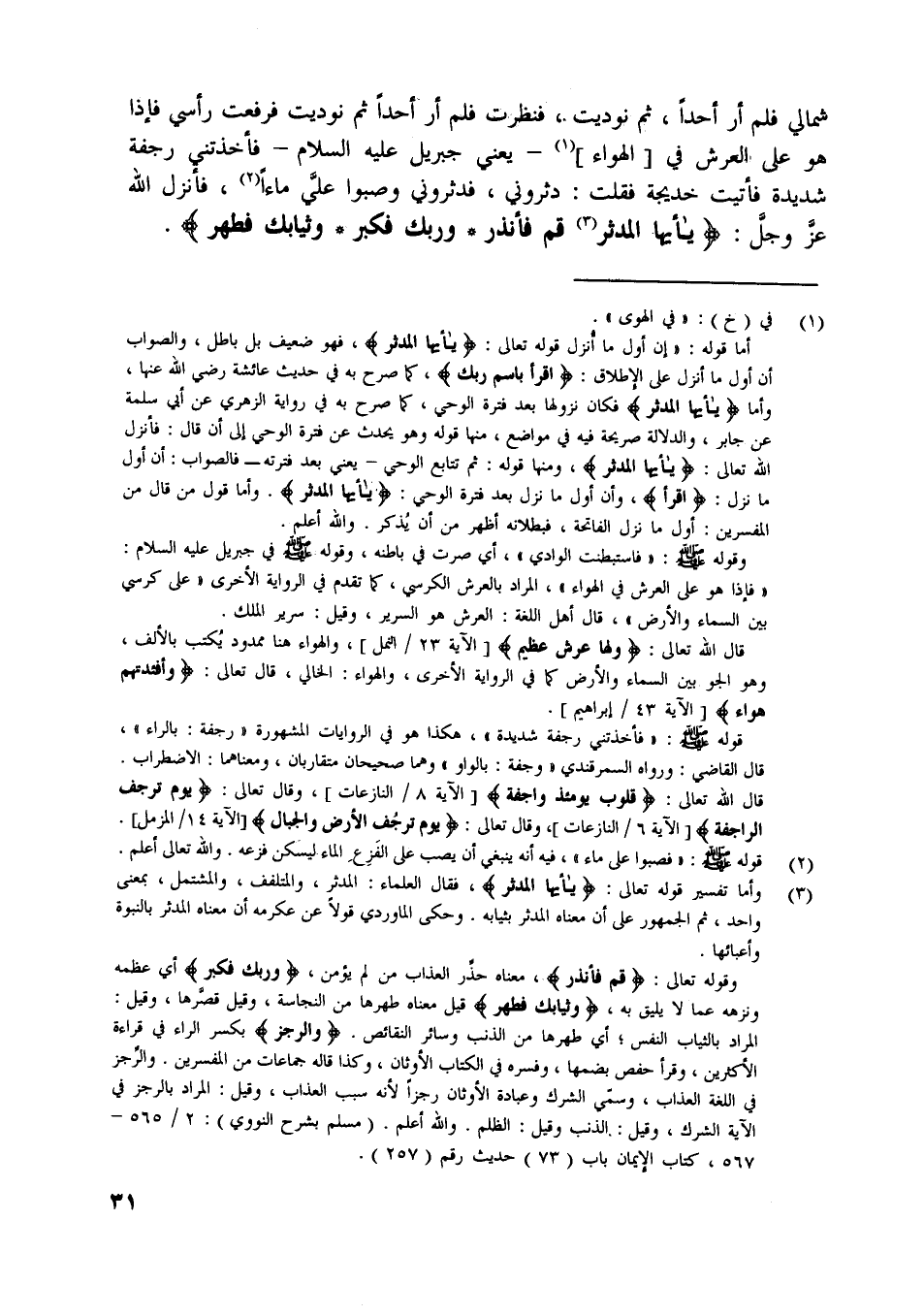 [ (3) ] وأما تفسير قوله تعالى: يا أَيُّهَا الْمُدَّثِّرُ، فقال العلماء: المدثر، والمتلفف، والمشتمل، بمعنى واحد، ثم الجمهور على أن معناه المدثر بثيابه. وحكى الماوردي قولا عن عكرمة أن معناه المدثر بالنّبوّة وأعبائها.