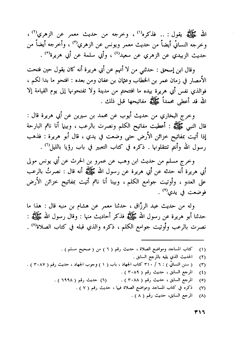 وله من حديث عبد الرزّاق، حدثنا معمر عن هشام بن منبه قال: هذا ما حدثنا أبو هريرة عن رسول اللَّه صلى اللَّه عليه وسلّم فذكر أحاديث منها: وقال رسول اللَّه صلى اللَّه عليه وسلّم: نصرت بالرعب وأوتيت جوامع الكلم، ذكره والّذي قبله في كتاب الصلاة [ (8) ] .