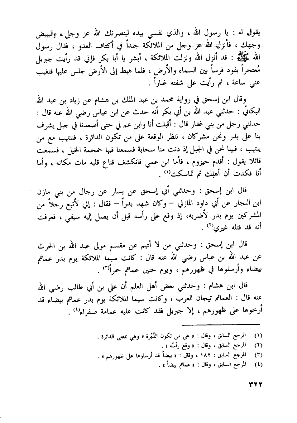 قال ابن هشام: وحدثني بعض أهل العلم أن علي بن أبي طالب رضي اللَّه عنه قال: العمائم تيجان العرب، وكانت سيما الملائكة يوم بدر عمائم بيضاء قد أرخوها على ظهورهم، إلا جبريل فقد كانت عليه عمامة صفراء [ (4) ] .