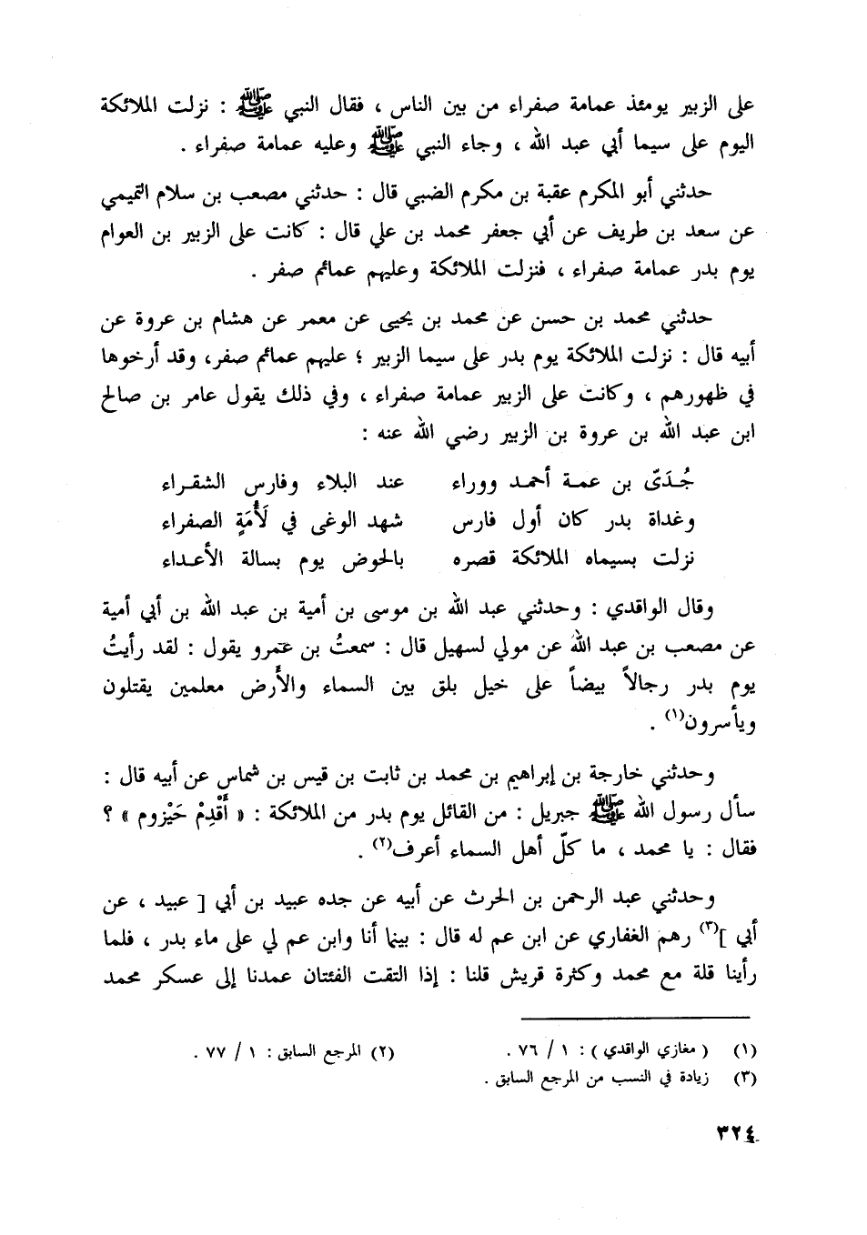 حدثني محمد بن حسن عن محمد بن يحيى عن معمر عن هشام بن عروة عن أبيه قال: نزلت الملائكة يوم بدر على سيما الزبير، عليهم عمائم صفر، وقد أرخوها في ظهورهم، وكانت على الزبير عمامة صفراء، وفي ذلك يقول عامر بن صالح ابن عبد اللَّه بن عروة بن الزبير رضي اللَّه عنه: