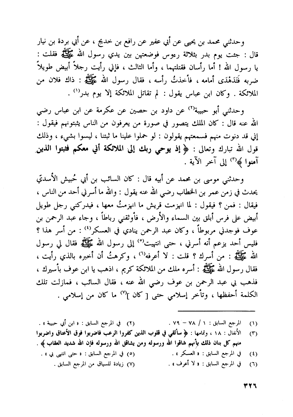 فليس أحد يزعم أنه أسرني، حتى انتهيت [ (5) ] إلى رسول اللَّه صلى اللَّه عليه وسلّم فقال لي رسول اللَّه صلى اللَّه عليه وسلّم: من أسرك؟ قلت: لا أعرفه [ (6) ] ، وكرهت أن أخبره بالذي رأيت، فقال رسول اللَّه صلى اللَّه عليه وسلّم: أسره ملك من الملائكة كريم، اذهب يا ابن عوف بأسيرك،