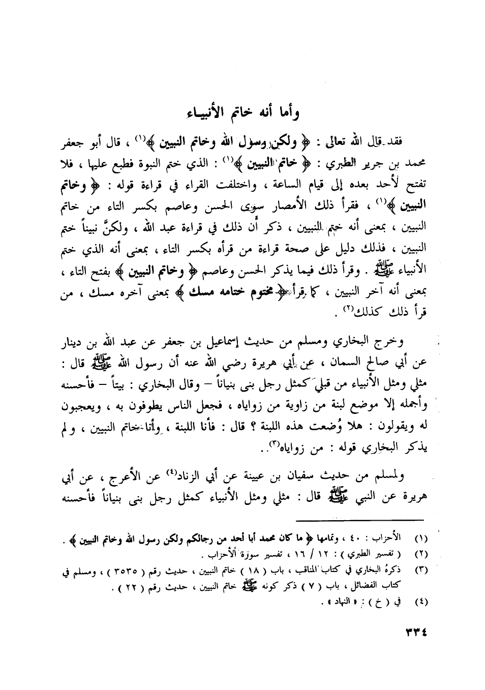 فقد قال اللَّه تعالى: وَلكِنْ رَسُولَ اللَّهِ وَخاتَمَ النَّبِيِّينَ [ (1) ] ، قال أبو جعفر محمد بن جرير الطبري: خاتَمَ النَّبِيِّينَ [ (1) ] : الّذي ختم النبوة فطبع عليها، فلا تفتح لأحد بعده إلى قيام الساعة، واختلفت القراء في قراءة قوله: وَخاتَمَ النَّبِيِّينَ [ (1) ] ، فقرأ ذلك الأمصار سوى الحسن وعاصم بكسر التاء من خاتم النبيين، بمعنى أنه ختم النبيين، ذكر أن ذلك في قراءة عبد اللَّه، ولكنّ نبينا ختم النبيين، فذلك دليل على صحة قراءة من قرأه بكسر التاء، بمعنى أنه الّذي ختم الأنبياء صلى اللَّه عليه وسلّم. وقرأ ذلك فيما يذكر الحسن وعاصم وَخاتَمَ النَّبِيِّينَ بفتح التاء، بمعنى أنه آخر النبيين، كما قرأ مَخْتُومٍ خِتامُهُ مِسْكٌ بمعنى آخره مسك، من قرأ ذلك كذلك [ (2) ] .