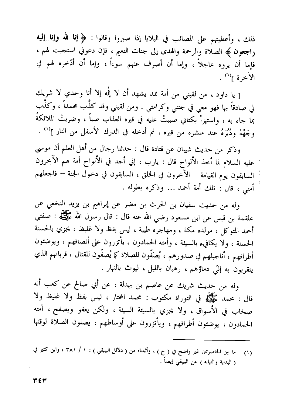 [يا داود، من لقيني من أمة محمد يشهد أن لا إله إلا أنا وحدي لا شريك لي صادقا بها فهو معي في جنتي وكرامتي. ومن لقيني وقد كذّب محمدا، وكذّب بما جاء به، واستهزأ بكتابي صببت عليه في قبره العذاب صبا، وضربت الملائكة وجهه ودبره عند منشره من قبره، ثم أدخله في الدرك الأسفل من النار] [ (1) ] .