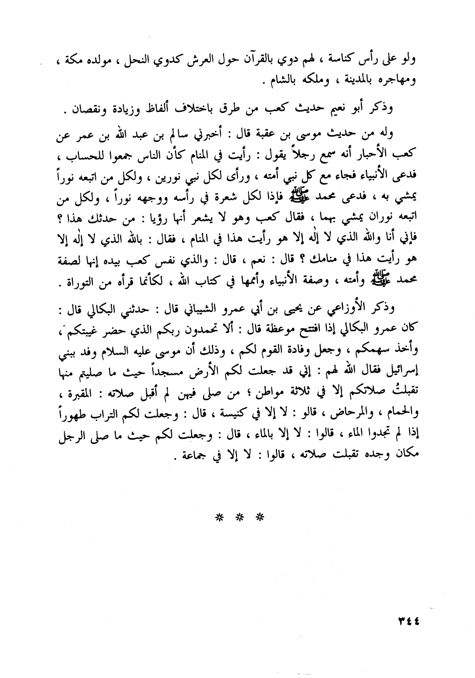 وله من حديث موسى بن عقبة قال: أخبرني سالم بن عبد اللَّه بن عمر عن كعب الأحبار أنه سمع رجلا يقول: رأيت في المنام كأن الناس جمعوا للحساب، فدعى الأنبياء فجاء مع كل نبي أمته، ورأى لكل نبي نورين، ولكل من اتبعه نورا يمشي به، فدعى محمد صلى اللَّه عليه وسلّم فإذا لكل شعرة في رأسه ووجهه نورا، ولكل من اتبعه نوران يمشي بهما، فقال كعب وهو لا يشعر أنها رؤيا: من حدثك هذا؟