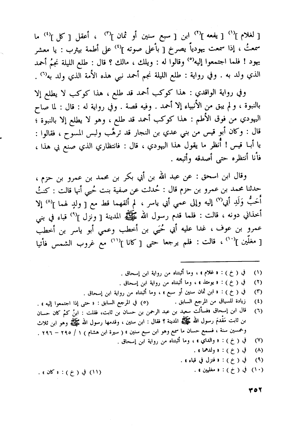 [لغلام] [ (1) ] [يفعه] [ (2) ] ابن [سبع سنين أو ثمان] [ (3) ] ، أعقل [كل] [ (4) ] ما سمعت، إذا سمعت يهوديا يصرخ [بأعلى صوته] [ (4) ] على أطمة بيثرب: يا معشر يهود! فلما اجتمعوا إليه [ (5) ] وقالوا له: ويلك، مالك؟ قال: طلع الليلة نجم أحمد الّذي ولد به. وفي رواية: طلع الليلة نجم أحمد نبي هذه الأمة الّذي ولد به [ (6) ] .
