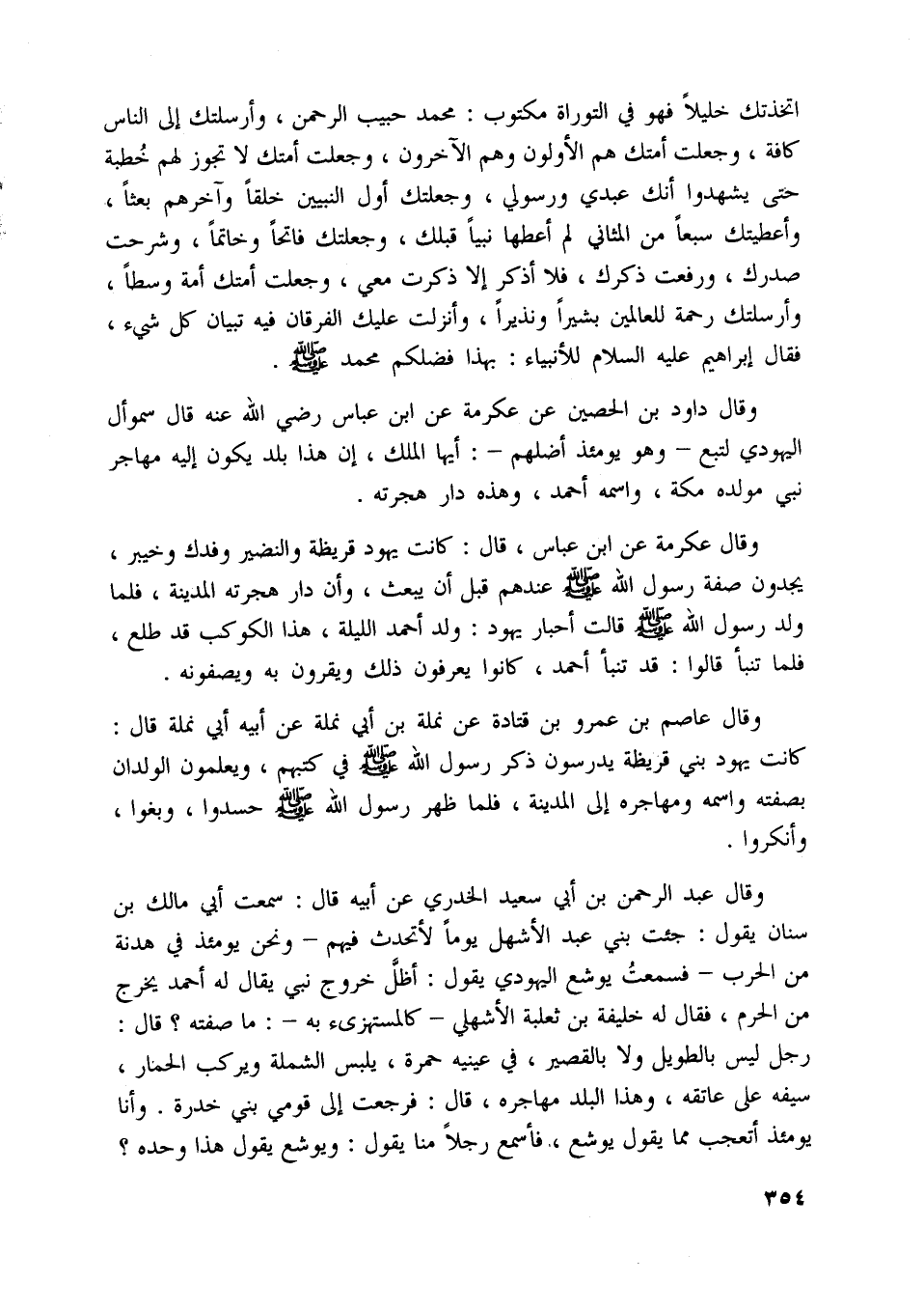 وقال عكرمة عن ابن عباس، قال: كانت يهود قريظة والنضير وفدك وخيبر، يجدون صفة رسول اللَّه صلى اللَّه عليه وسلّم عندهم قبل أن يبعث، وأن دار هجرته المدينة، فلما ولد رسول اللَّه صلى اللَّه عليه وسلّم قالت أحبار يهود: ولد أحمد الليلة، هذا الكوكب قد طلع، فلما تنبأ قالوا: قد تنبأ أحمد، كانوا يعرفون ذلك ويقرون به ويصفونه.
