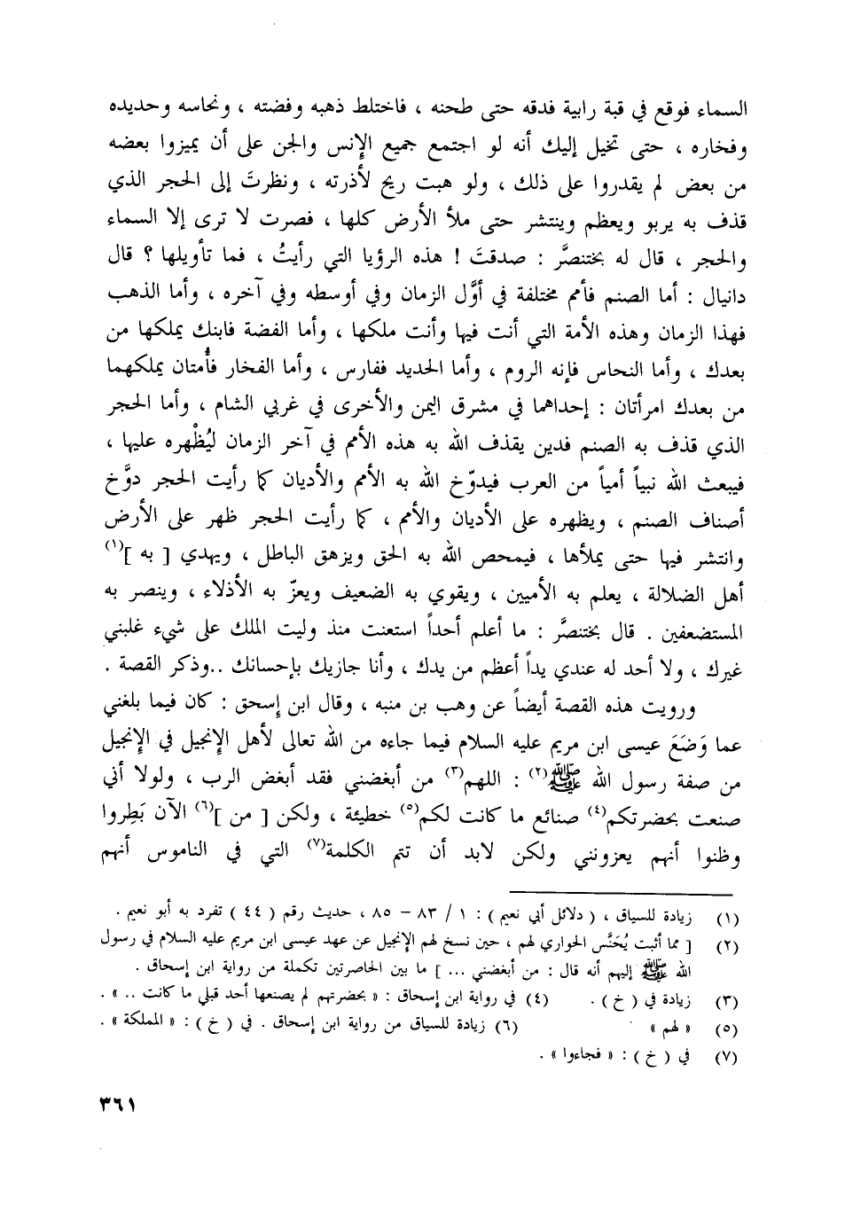 السماء فوقع في قبة رابية فدقه حتى طحنه، فاختلط ذهبه وفضته، ونحاسه وحديدة وفخاره، حتى تخيل إليك أنه لو اجتمع جميع الإنس والجن على أن يميزوا بعضه من بعض لم يقدروا على ذلك، ولو هبت ريح لأذرته، ونظرت إلى الحجر الّذي قذف به يربو ويعظم وينتشر حتى ملأ الأرض كلها، فصرت لا ترى إلا السماء والحجر، قال له بخت نصّر: صدقت! هذه الرؤيا التي رأيت، فما تأويلها؟ قال دانيال: أما الصنم فأمم مختلفة في أوّل الزمان وفي أوسطه وفي آخره، وأما الذهب فهذا الزمان وهذه الأمة التي أنت فيها وأنت ملكها، وأما الفضة فابنك يملكها من بعدك، وأما النحاس فإنه الروم، وأما الحديد ففارس، وأما الفخار فأمتان يملكها من بعدك امرأتان: إحداهما في مشرق اليمن والأخرى في غربي الشام، وأما الحجر الّذي قذف به الصنم فدين يقذف اللَّه به هذه الأمم في آخر الزمان ليظهره عليها، فيبعث اللَّه نبيا أميا من العرب فيدوّخ اللَّه به الأمم والأديان كما رأيت الحجر دوّخ أصناف الصنم، ويظهره على الأديان والأمم، كما رأيت الحجر ظهر على الأرض وانتشر فيها حتى يملأها، فيمحص اللَّه به الحق ويزهق الباطل، ويهدي [به] [ (1) ] أهل الضلالة، يعلم به الأميين، ويقوي به الضعيف ويعزّ به الأذلاء، وينصر به المستضعفين. قال بخت نصّر: ما أعلم أحدا استعنت منذ وليت الملك على شيء غلبني غيرك، ولا أحد له عندي يدا أعظم من يدك، وأنا جازيك بإحسانك.. وذكر القصة.