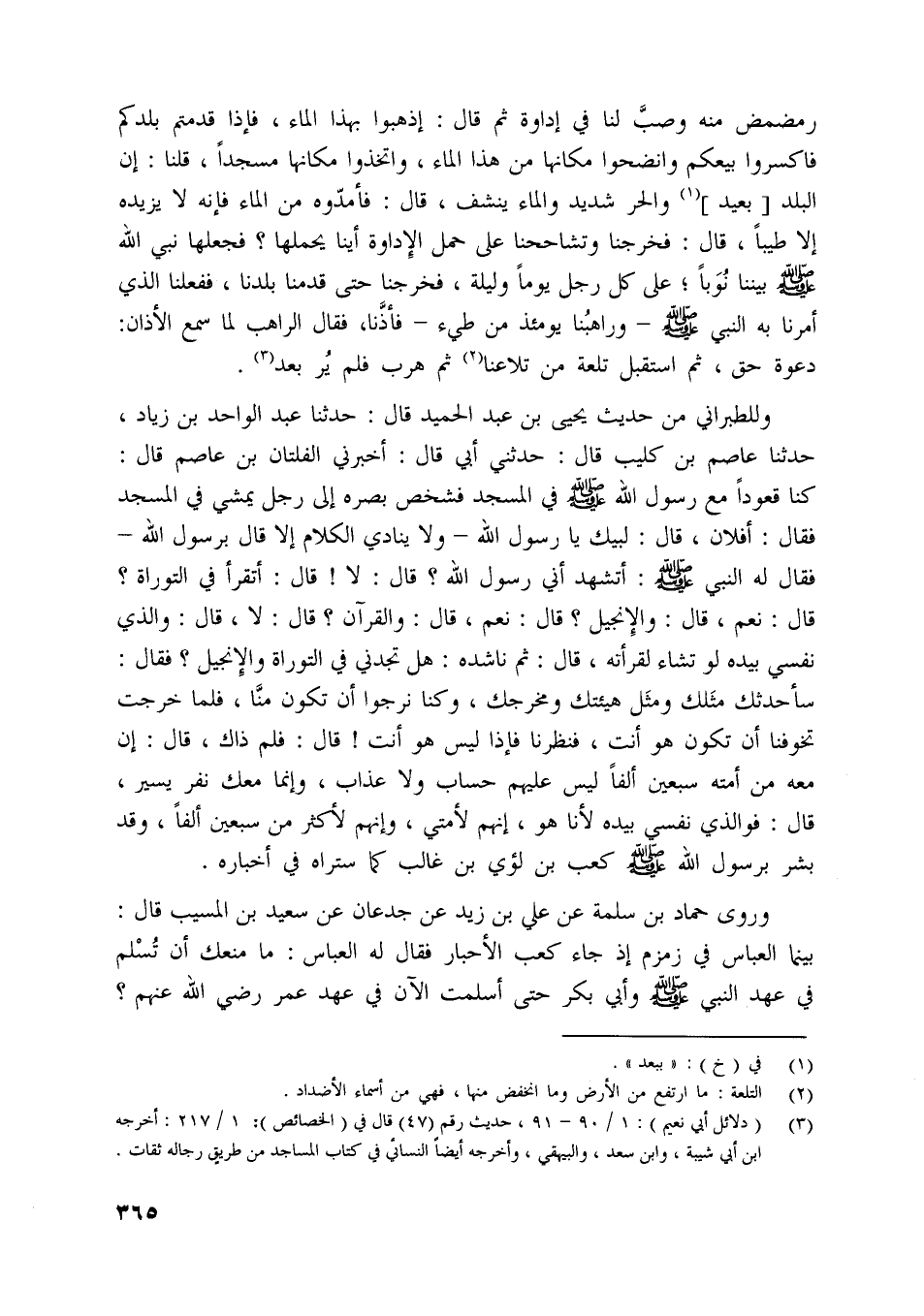 [ (3) ] (دلائل أبي نعيم) : 1/ 90- 91، حديث رقم (47) قال في (الخصائص) : 1/ 217: أخرجه ابن أبي شيبة، وابن سعد، والبيهقي، وأخرجه أيضا النسائي في كتاب المساجد من طريق رجاله ثقات.