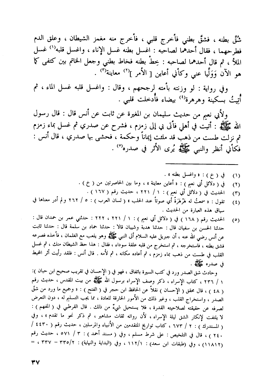 حدثنا الحسن بن سفيان قال: حدثنا هدبة وشيبان قالا: حدثنا حماد بن سلمة قال: حدثنا ثابت عن أنس رضي اللَّه عنه، أن جبريل عليه السلام أتى النبي صلّى اللَّه عليه وسلّم وهو يلعب مع الغلمان، فأخذه فصرعه فشق بطنه، فاستخرجه، ثم استخرج من قلبه علقة سوداء، فقال: هذا حظ الشيطان منك، ثم غسل القلب في طست من ذهب بماء زمزم، ثم أعاده مكانه، ثم لأمه. قال أنس: فلقد رأيت أثر المخيط في صدره صلّى اللَّه عليه وسلّم.