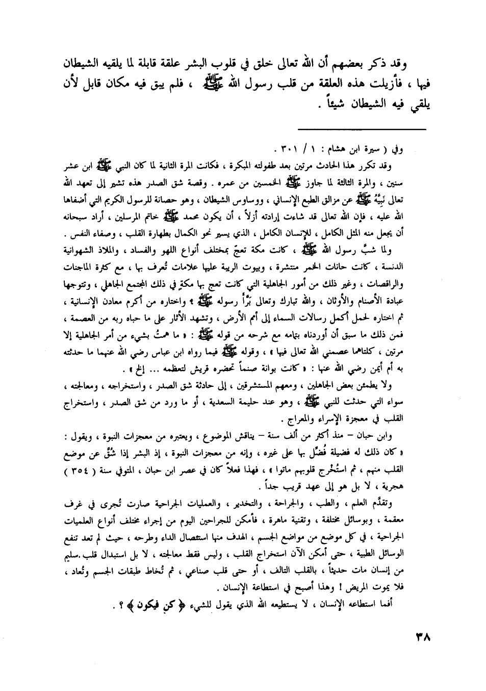 «كان ذلك له فضيلة فضّل بها على غيره، وإنه من معجزات النبوة، إذ البشر إذا شقّ عن موضع القلب منهم، ثم استخرج قلوبهم ماتوا» ، فهذا فعلا كان في عصر ابن حبان، المتوفى سنة (354) هجرية، لا بل هو إلى عهد قريب جدا.