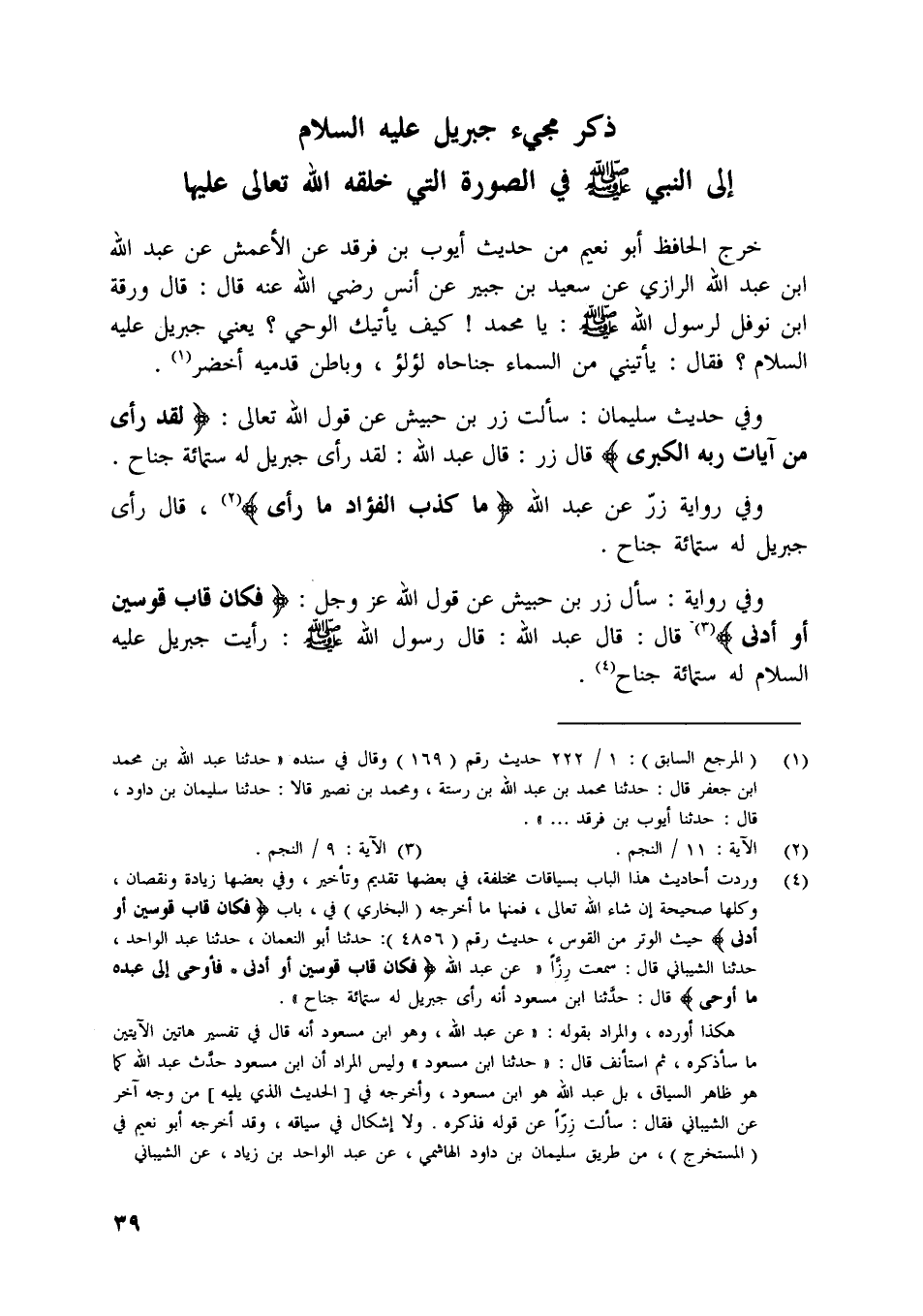 [ (4) ] وردت أحاديث هذا الباب بسياقات مختلفة، في بعضها تقديم وتأخير، وفي بعضها زيادة ونقصان، وكلها صحيحة إن شاء اللَّه تعالى، فمنها ما أخرجه (البخاري) في، باب فَكانَ قابَ قَوْسَيْنِ أَوْ أَدْنى حيث الوتر من القوس، حديث رقم (4856) : حدثنا أبو النعمان، حدثنا عبد الواحد، حدثنا الشيبانيّ قال: سمعت رزّا «عن عبد اللَّه فَكانَ قابَ قَوْسَيْنِ أَوْ أَدْنى * فَأَوْحى إِلى عَبْدِهِ ما أَوْحى قال: حدّثنا ابن مسعود أنه رأى جبريل له ستمائة جناح» .