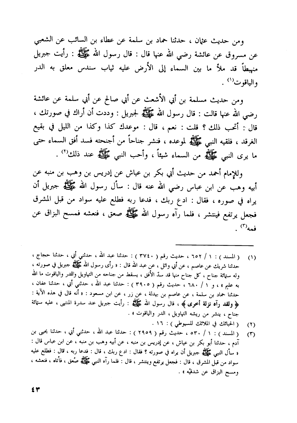 [ (1) ] (المسند) : 1/ 652، حديث رقم (3740) : حدثنا عبد اللَّه، حدثني أبي، حدثنا حجاج، حدثنا شريك عن عاصم، عن أبي وائل، عن عبد اللَّه قال: «رأى رسول اللَّه صلّى اللَّه عليه وسلّم جبريل في صورته، وله ستمائة جناح، كل جناح منها قد سدّ الأفق، يسقط من جناحه من التهاويل والدر والياقوت ما اللَّه به عليم» ،