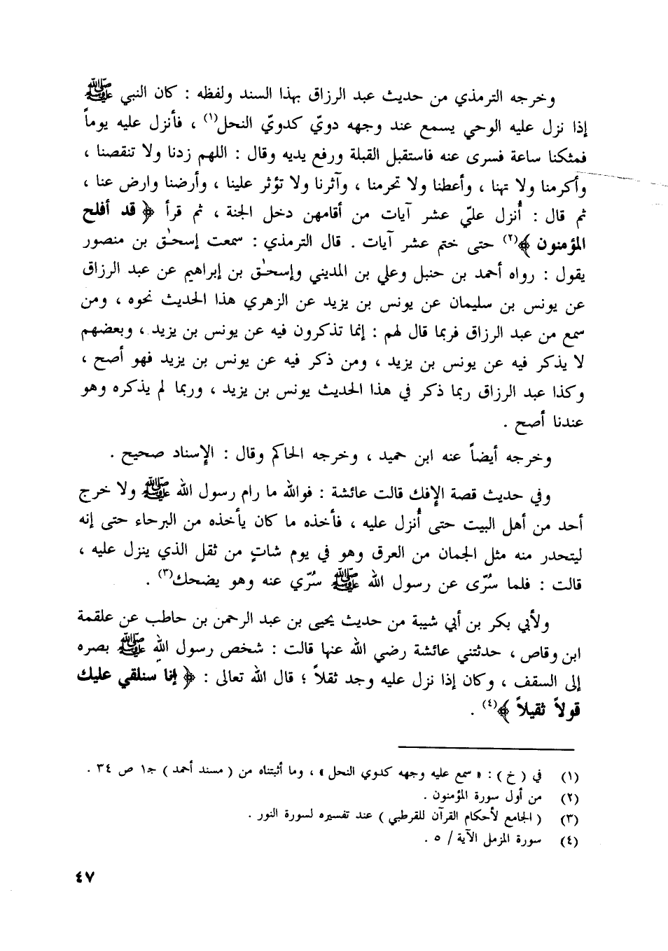 ولأبي بكر بن أبي شيبة من حديث يحيى بن عبد الرحمن بن حاطب عن علقمة ابن وقاص، حدثتني عائشة رضي اللَّه عنها قالت: شخص رسول اللَّه صلّى اللَّه عليه وسلّم بصره إلى السقف، وكان إذا نزل عليه وجد ثقلا، قال اللَّه تعالى: إِنَّا سَنُلْقِي عَلَيْكَ قَوْلًا ثَقِيلًا [ (4) ] .