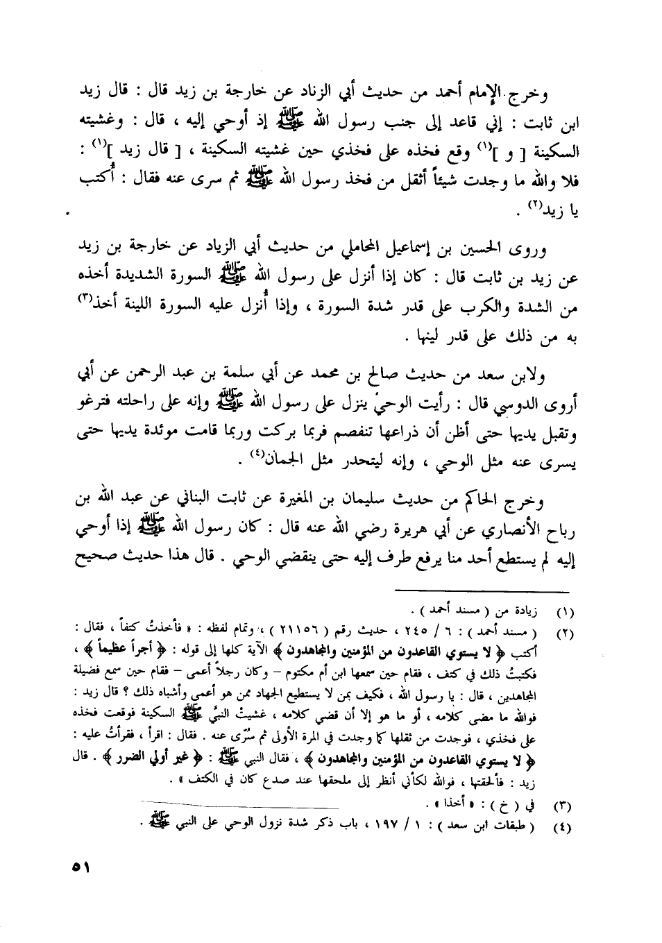 [ (4) ] (طبقات ابن سعد) : 1/ 197، باب ذكر شدة نزول الوحي على النبي صلّى اللَّه عليه وسلّم.