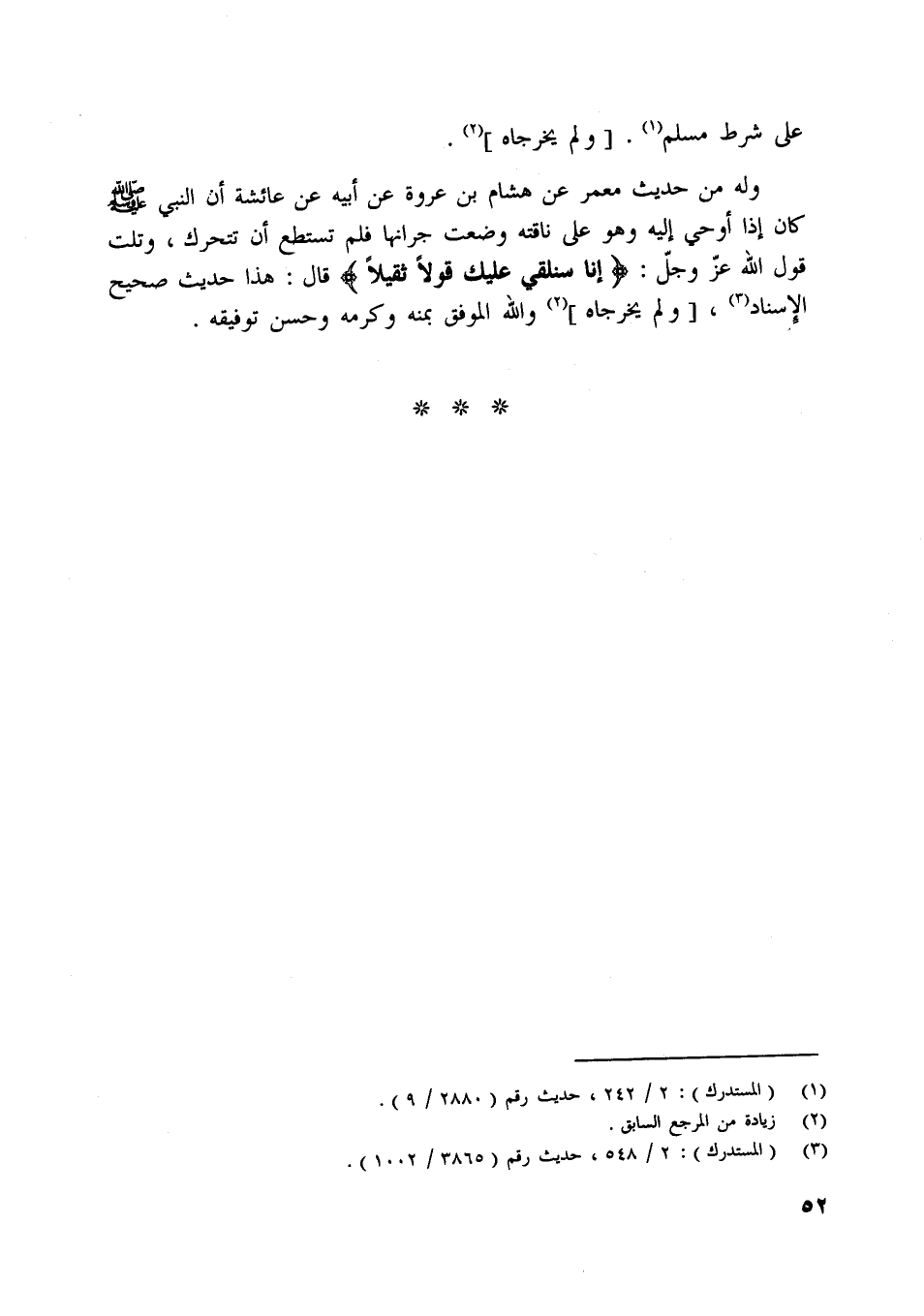 وله من حديث معمر عن هشام بن عروة عن أبيه عن عائشة أن النبي صلّى اللَّه عليه وسلّم كان إذا أوحي إليه وهو على ناقته وضعت جرانها فلم تستطع أن تتحرك، وتلت قول اللَّه عزّ وجلّ: إِنَّا سَنُلْقِي عَلَيْكَ قَوْلًا ثَقِيلًا قال: هذا حديث صحيح الإسناد [ (3) ] ، [ولم يخرجاه] [ (2) ] واللَّه الموفق بمنه وكرمه وحسن توفيقه.