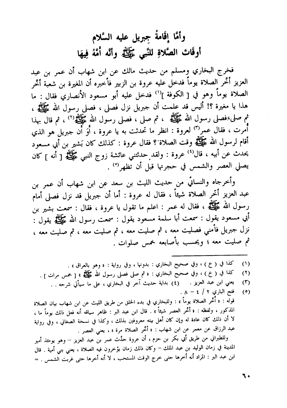 وأخرجاه والنسائي من حديث الليث بن سعد عن ابن شهاب أن عمر بن عبد العزيز أخّر الصلاة شيئا، فقال له عروة: أما أن جبريل قد نزل فصلى أمام رسول اللَّه صلّى اللَّه عليه وسلّم، فقال له عمر: اعلم ما تقول يا عروة، فقال: سمعت بشير بن أبي مسعود يقول: سمعت أبا سلمة مسعود يقول: سمعت رسول اللَّه صلّى اللَّه عليه وسلّم يقول: نزل جبريل فأمني فصليت معه، ثم صليت معه، ثم صليت معه، ثم صليت معه، ثم صليت معه، ويحسب بأصابعه خمس صلوات.