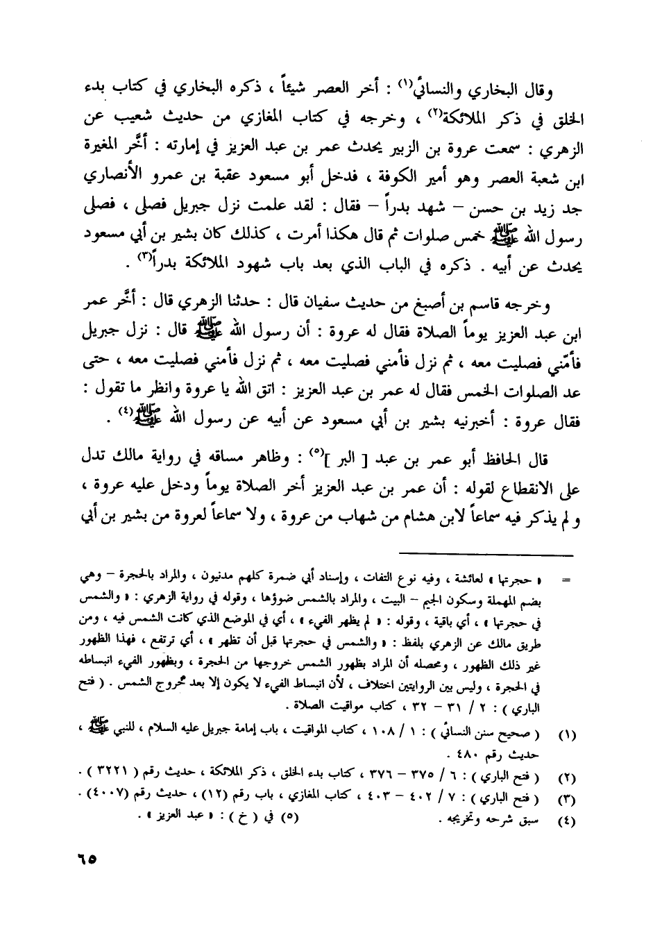 وقال البخاري والنسائي [ (1) ] : أخر العصر شيئا، ذكره البخاري في كتاب بدء الخلق في ذكر الملائكة [ (2) ] ، وخرجه في كتاب المغازي من حديث شعيب عن الزهري: سمعت عروة بن الزبير يحدث عمر بن عبد العزيز في إمارته: أخّر المغيرة ابن شعبة العصر وهو أمير الكوفة، فدخل أبو مسعود عقبة بن عمرو الأنصاري جد زيد بن حسن- شهد بدرا- فقال: لقد علمت نزل جبريل فصلّى، فصلّى رسول اللَّه صلّى اللَّه عليه وسلّم خمس صلوات ثم قال هكذا أمرت، كذلك كان بشير بن أبي مسعود يحدث عن أبيه. ذكره في الباب الّذي بعد باب شهود الملائكة بدرا [ (3) ] .