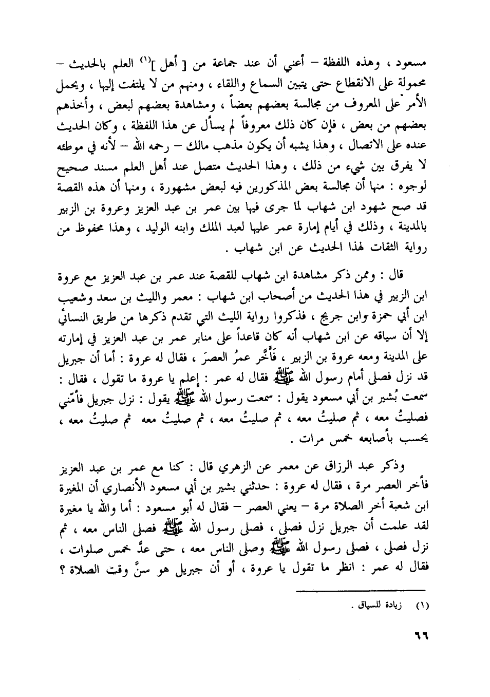 مسعود، وهذه اللفظة- أعني أن عند جماعة من [أهل] [ (1) ] العلم بالحديث- محمولة على الانقطاع حتى يتبين السماع واللقاء، ومنهم من لا يلتفت إليها، ويحمل الأمر على المعروف من مجالسة بعضهم بعضا، ومشاهدة بعضهم لبعض، وأخذهم بعضهم من بعض، فإن كان ذلك معروفا لم يسأل عن هذا اللفظة، وكان الحديث عنده على الاتصال، وهذا يشبه أن يكون مذهب مالك- رحمه اللَّه- لأنه في موطئه لا يفرق بين شيء من ذلك، وهذا الحديث متصل عند أهل العلم مسند صحيح لوجوه: منها أن مجالسة بعض المذكورين فيه لبعض مشهورة، ومنها أن هذه القصة قد صح شهود ابن شهاب لما جرى فيها بين عمر بن عبد العزيز وعروة بن الزبير بالمدينة، وذلك في أيام إمارة عمر عليها لعبد الملك وابنه الوليد، وهذا محفوظ من رواية الثقات لهذا الحديث عن ابن شهاب.