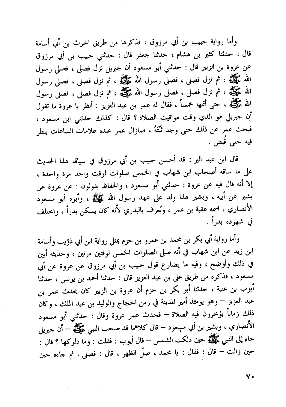 وأما رواية حبيب بن أبي مرزوق، فذكرها من طريق الحرث بن أبي أسامة قال: حدثنا كثير بن هشام، حدثنا جعفر قال: حدثني حبيب بن أبي مرزوق عن عروة بن الزبير قال: حدثني أبو مسعود أن جبريل نزل فصلّى، فصلّى رسول اللَّه صلّى اللَّه عليه وسلّم، ثم نزل فصلّى، فصلّى رسول اللَّه صلّى اللَّه عليه وسلّم، ثم نزل فصلّى، فصلّى رسول اللَّه صلّى اللَّه عليه وسلّم، ثم نزل فصلّى، فصلّى رسول اللَّه صلّى اللَّه عليه وسلّم، ثم نزل فصلّى، فصلّى رسول اللَّه صلّى اللَّه عليه وسلّم، حتى أتمها خمسا، فقال له عمر بن عبد العزيز: انظر يا عروة ما تقول أن جبريل هو الّذي وقت مواقيت الصلاة؟ قال: كذلك حدثني ابن مسعود، فبحث عمر عن ذلك حتى وجد ثبته، فما زال عمر عنده علامات الساعات ينظر فيه حتى قبض.