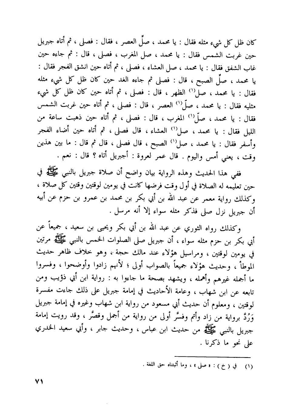 ففي هذا الحديث وهذه الرواية بيان واضح أن صلاة جبريل بالنبيّ صلّى اللَّه عليه وسلّم في حين تعليمه له الصلاة في أول وقت فرضها كانت في يومين لوقتين وقتين كل صلاة، وكذلك رواية معمر عن عبد اللَّه بن أبي بكر بن محمد بن عمرو بن حزم عن أبيه أن جبريل نزل صلى فذكر مثله سواء إلا أنه مرسل.