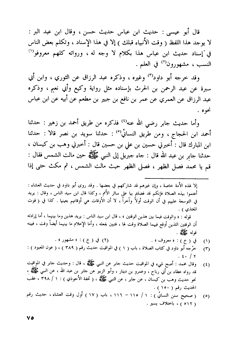 وأما حديث جابر رضي اللَّه عنه [ (4) ] فذكره من طريق أحمد بن زهير: حدثنا أحمد ابن الحجاج، ومن طريق النسائي [ (5) ] : حدثنا سويد بن نصر قالا: حدثنا ابن المبارك قال: أخبرني حسين بن علي بن حسين قال: أخبرني وهب بن كيسان، حدثنا جابر بن عبد اللَّه قال: جاء جبريل إلى النبي صلّى اللَّه عليه وسلّم حين مالت الشمس فقال: