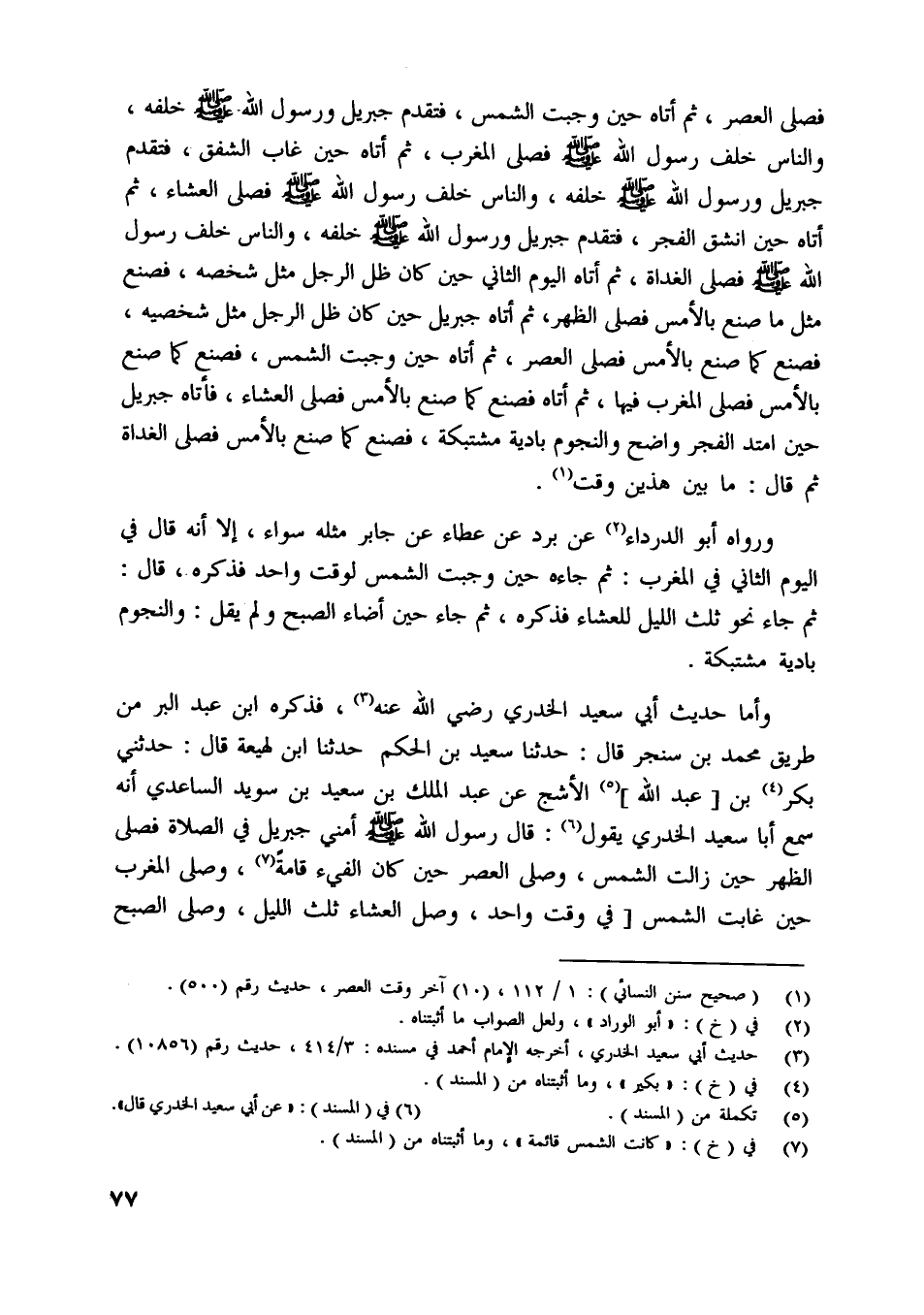 وأما حديث أبي سعيد الخدريّ رضي اللَّه عنه [ (3) ] ، فذكره ابن عبد البر من طريق محمد بن سنجر قال: حدثنا سعيد بن الحكم حدثنا ابن لهيعة قال: حدثني بكر [ (4) ] بن [عبد اللَّه] [ (5) ] الأشج عن عبد الملك بن سعيد بن سويد الساعدي أنه سمع أبا سعيد الخدريّ يقول [ (6) ] : قال رسول اللَّه صلّى اللَّه عليه وسلّم أمني جبريل في الصلاة فصلّى الظهر حين زالت الشمس، وصلّى العصر حين كان الفيء قامة [ (7) ] ، وصلّى المغرب حين غابت الشمس [في وقت واحد، وصل العشاء ثلث الليل، وصلّى الصبح