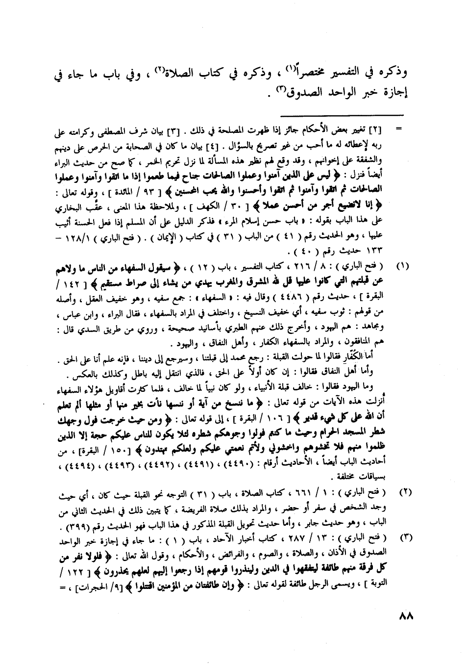 [ (3) ] (فتح الباري) : 13/ 287، كتاب أخبار الآحاد، باب (1) : ما جاء في إجازة خبر الواحد الصدوق في الأذان، والصلاة، والصوم، والفرائض، والأحكام، وقول اللَّه تعالى: فَلَوْلا نَفَرَ مِنْ كُلِّ فِرْقَةٍ مِنْهُمْ طائِفَةٌ لِيَتَفَقَّهُوا فِي الدِّينِ وَلِيُنْذِرُوا قَوْمَهُمْ إِذا رَجَعُوا إِلَيْهِمْ لَعَلَّهُمْ يَحْذَرُونَ [122/ التوبة] ، ويسمى الرجل طائفة لقوله تعالى: وَإِنْ طائِفَتانِ مِنَ الْمُؤْمِنِينَ اقْتَتَلُوا [9/ الحجرات] ،