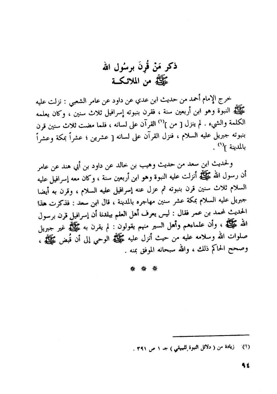 ولحديث ابن سعد من حديث وهيب بن خالد عن داود بن أبي هند عن عامر أن رسول اللَّه صلى اللَّه عليه وسلّم أنزلت عليه النبوة وهو ابن أربعين سنة، وكان معه إسرافيل عليه السلام ثلاث سنين قرن بنبوته ثم عزل عنه إسرافيل عليه السلام، وقرن به أيضا جبريل عليه السلام بمكة عشر سنين مهاجره بالمدينة، قال ابن سعد: فذكرت هذا الحديث لمحمد بن عمر فقال: ليس يعرف أهل العلم ببلدنا أن إسرافيل قرن برسول اللَّه صلى اللَّه عليه وسلّم، وأن علماءهم وأهل السير منهم يقولون: لم يقرن به صلى اللَّه عليه وسلّم غير جبريل صلوات اللَّه وسلامه عليه من حيث أنزل عليه صلى اللَّه عليه وسلّم الوحي إلى أن قبض صلى اللَّه عليه وسلّم، وصحح الحاكم ذلك، واللَّه سبحانه الموفق بمنه.
