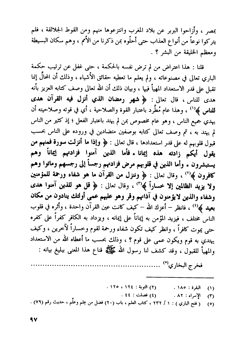 [ (5) ] (فتح الباري) : 1/ 232، كتاب العلم، باب (20) فضل من علم وعلّم، حديث رقم (79) .