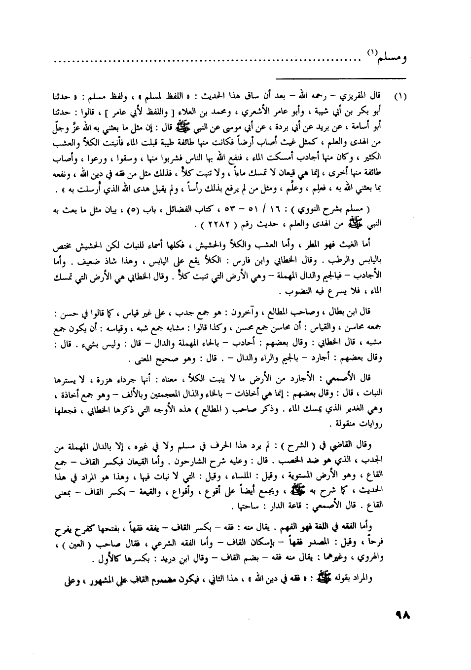قال المقريزي- رحمه اللَّه- بعد أن ساق هذا الحديث: «اللفظ لمسلم» ، ولفظ مسلم: «حدثنا أبو بكر بن أبي شيبة، وأبو عامر الأشعري، ومحمد بن العلاء [واللفظ لأبي عامر] ، قالوا: حدثنا أبو أسامة، عن بريد عن أبي بردة، عن أبي موسى عن النبي صلى اللَّه عليه وسلّم قال: إن مثل ما بعثني به اللَّه عزّ وجلّ من الهدى والعلم، كمثل غيث أصاب أرضا فكانت منها طائفة طيبة قبلت الماء فأنبتت الكلا والعشب الكثير، وكان منها أجادب أمسكت الماء، فنفع اللَّه بها الناس فشربوا منها، وسقوا، ورعوا، وأصاب طائفة منها أخرى، إنما هي قيعان لا تمسك ماء، ولا تنبت كلأ، فذلك مثل من فقه في دين اللَّه، ونفعه بما بعثني اللَّه به، فعلم، وعلّم، ومثل من لم يرفع بذلك رأسا، ولم يقبل هدى اللَّه الّذي أرسلت به» .