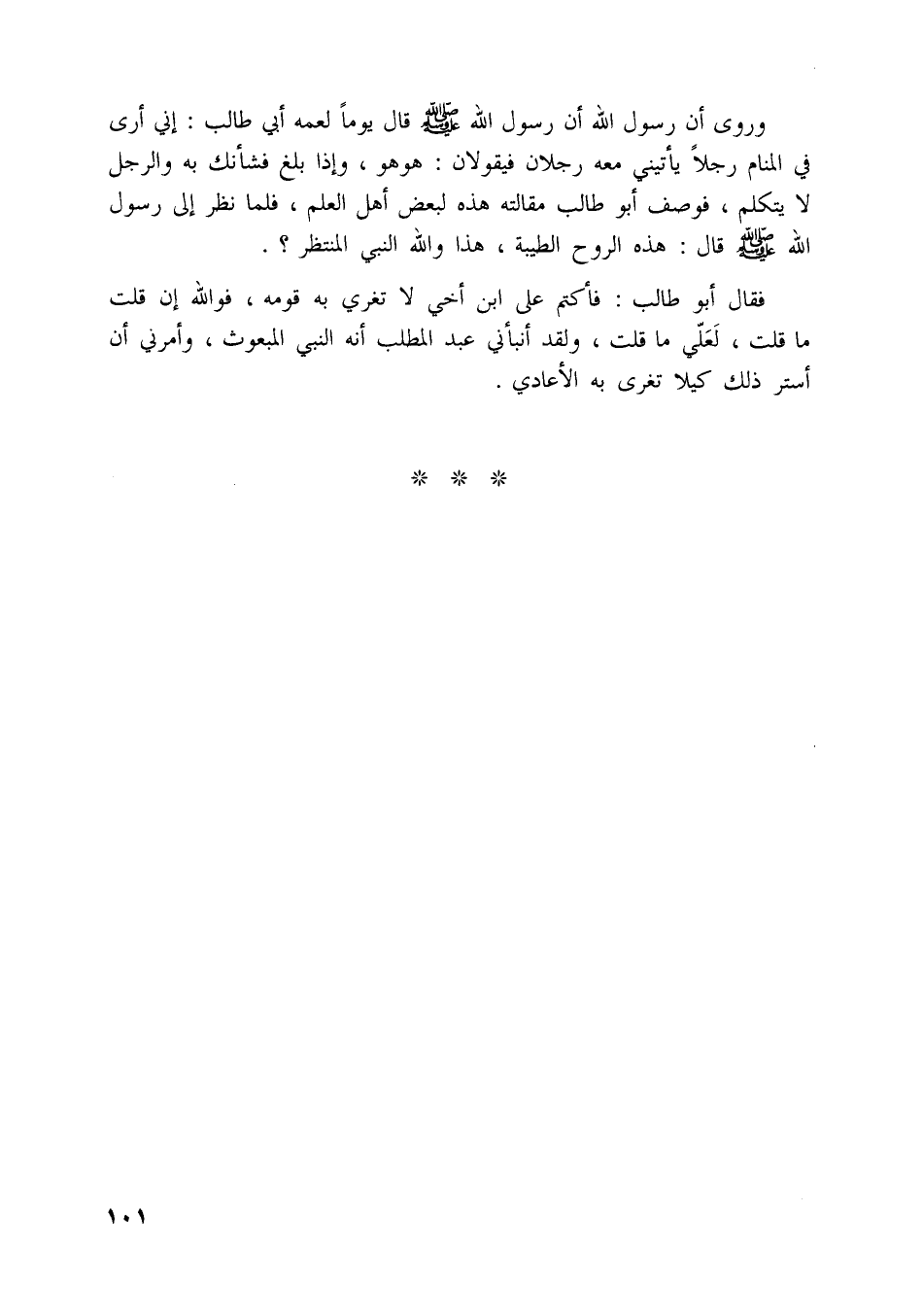 وروى أن رسول اللَّه صلّى اللَّه عليه وسلم قال يوما لعمه أبي طالب: إني أرى في المنام رجلا يأتيني معه رجلان فيقولان: هو هو، وإذا بلغ فشأنك به والرجل لا يتكلم، فوصف أبو طالب مقالته هذه لبعض أهل العلم، فلما نظر إلى رسول اللَّه صلّى اللَّه عليه وسلم قال: هذه الروح الطيبة، هذا واللَّه النبي المنتظر؟