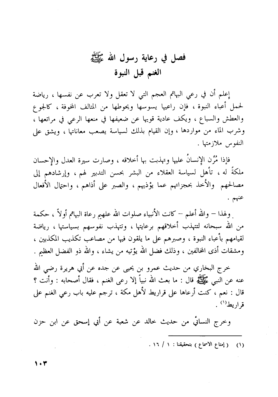 اعلم أن في رعي البهائم العجم التي لا تعقل ولا تعرب عن نفسها، رياضة لحمل أعباء النبوة، فإن راعيها يسوسها ويحوطها من المتالف المخوفة، كالجوع والعطش والسباع، ويكف عادية قويها عن ضعيفها في منعها الرعي في مراتعها، وشرب الماء من مواردها، وإن القيام بذلك لسياسة يصعب معاناتها، ويشق على النفوس ملازمتها.