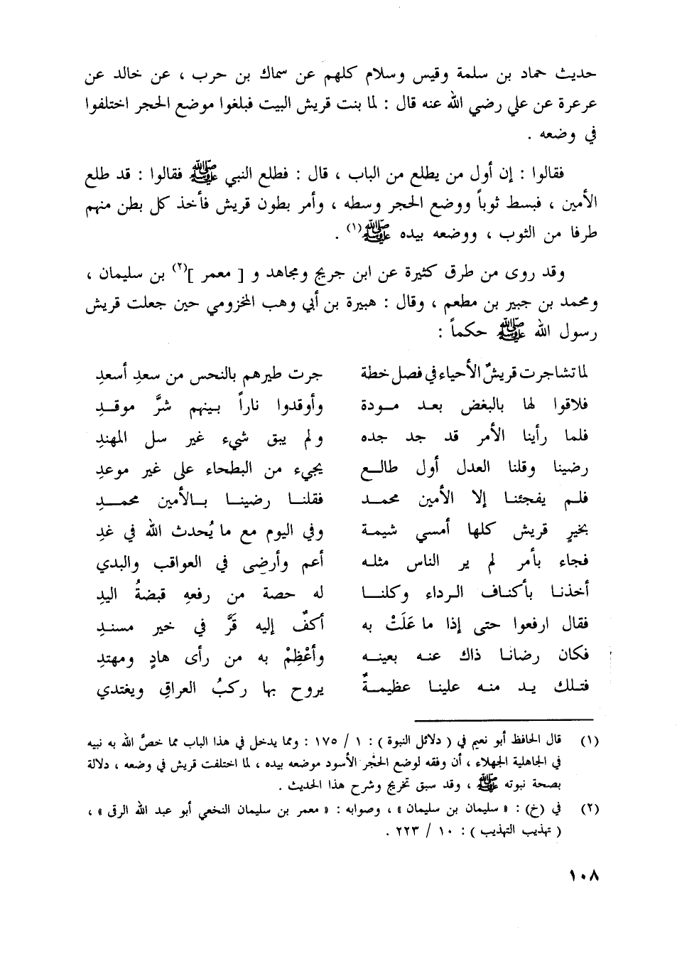 [ (1) ] قال الحافظ أبو نعيم في (دلائل النبوة) : 1/ 175: ومما يدخل في هذا الباب مما خصّ اللَّه به نبيه في الجاهلية الجهلاء، أن وفقه لوضع الحجر الأسود موضعه بيده، لما اختلفت قريش في وضعه، دلالة بصحة نبوته صلّى اللَّه عليه وسلم، وقد سبق تخريج وشرح هذا الحديث.