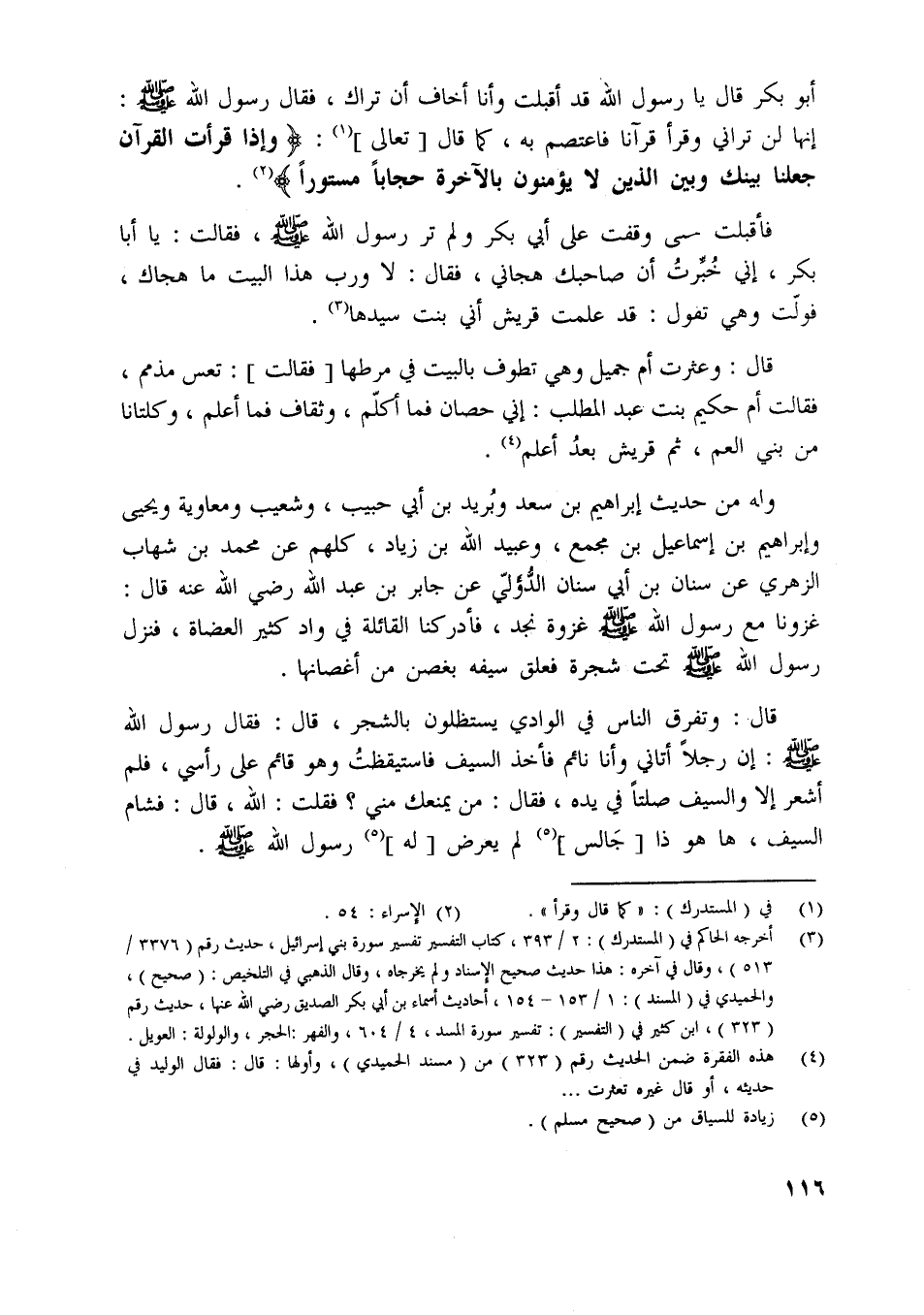 [ (3) ] أخرجه الحاكم في (المستدرك) : 2/ 393، كتاب التفسير تفسير سورة بني إسرائيل، حديث رقم (3376/ 513) ، وقال في آخره: هذا حديث صحيح الإسناد ولم يخرجاه، وقال الذهبي في التلخيص: (صحيح) ، والحميدي في (المسند) : 1/ 153- 154، أحاديث أسماء بن أبي بكر الصديق رضي اللَّه عنها، حديث رقم (323) ، ابن كثير في (التفسير) : تفسير سورة المسد، 4/ 604، والفهر: الحجر، والولولة: العويل.