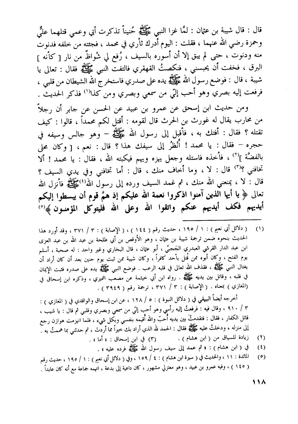 [ (1) ] (دلائل أبي نعيم) : 1/ 195، حديث رقم (144) ، (الإصابة) : 3/ 371، وقد أورد هذا الحديث بنحوه ضمن ترجمة شيبة بن عثمان، وهو الأوقص بن أبي طلحة بن عبد اللَّه بن عبد العزى ابن عبد الدار القرشي العبدري الحجبيّ، أبو عثمان، قال البخاري وغير واحد: له صحبة، أسلم يوم الفتح، وكان أبوه ممن قتل بأحد كافرا، وكان شيبة ممن ثبت يوم حنين بعد أن كان أراد أن يغتال النبي صلّى اللَّه عليه وسلم، فقذف اللَّه تعالى في قلبه الرعب. فوضع النبي صلّى اللَّه عليه وسلم يده على صدره فثبت الإيمان في قلبه، وقاتل بين يديه صلّى اللَّه عليه وسلم. رواه ابن أبي خيثمة عن مصعب النميري، وذكره ابن إسحاق في (المغازي) بمعناه. (الإصابة) : 3/ 371، ترجمة رقم (3949) .