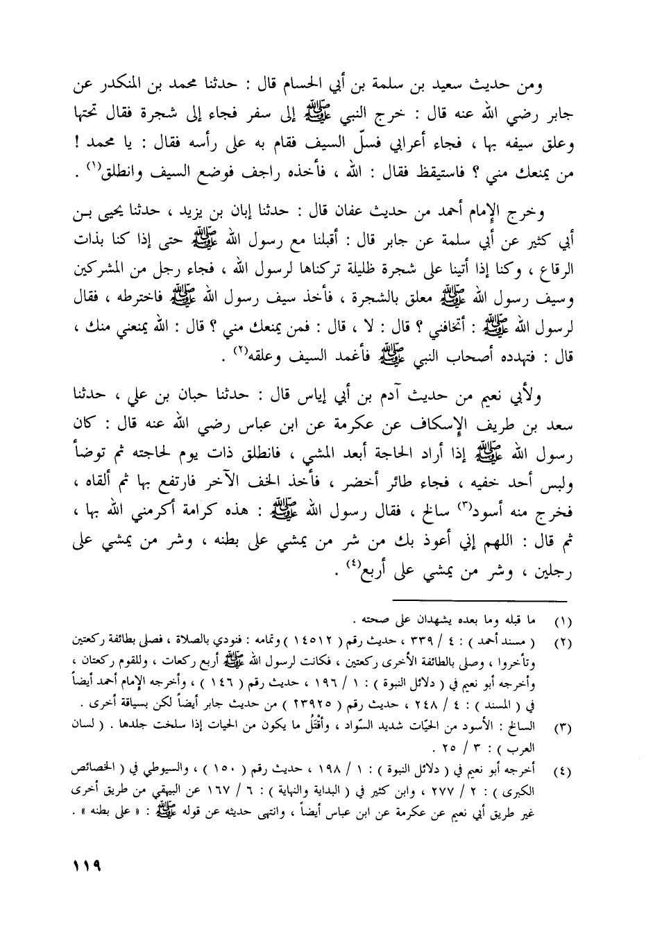 ومن حديث سعيد بن سلمة بن أبي الحسام قال: حدثنا محمد بن المنكدر عن جابر رضي اللَّه عنه قال: خرج النبي صلّى اللَّه عليه وسلم إلى سفر فجاء إلى شجرة فقال تحتها وعلق سيفه بها، فجاء أعرابي فسلّ السيف فقام به على رأسه فقال: يا محمد! من يمنعك مني؟ فاستيقظ فقال: اللَّه، فأخذه راجف فوضع السيف وانطلق [ (1) ] .