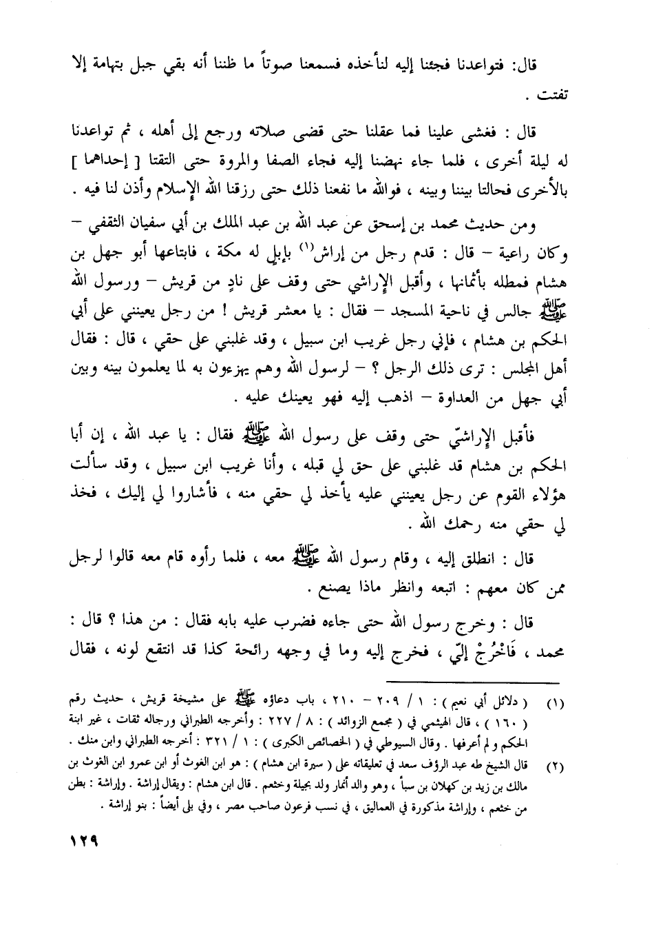فأقبل الإراشيّ [ (2) ] حتى وقف على رسول اللَّه صلّى اللَّه عليه وسلم فقال: يا عبد اللَّه، إن أبا الحكم بن هشام قد غلبني على حق لي قبله، وأنا غريب ابن سبيل، وقد سألت هؤلاء القوم عن رجل يعينني عليه يأخذ لي حقي منه، فأشاروا لي إليك، فخذ لي حقي منه رحمك اللَّه.