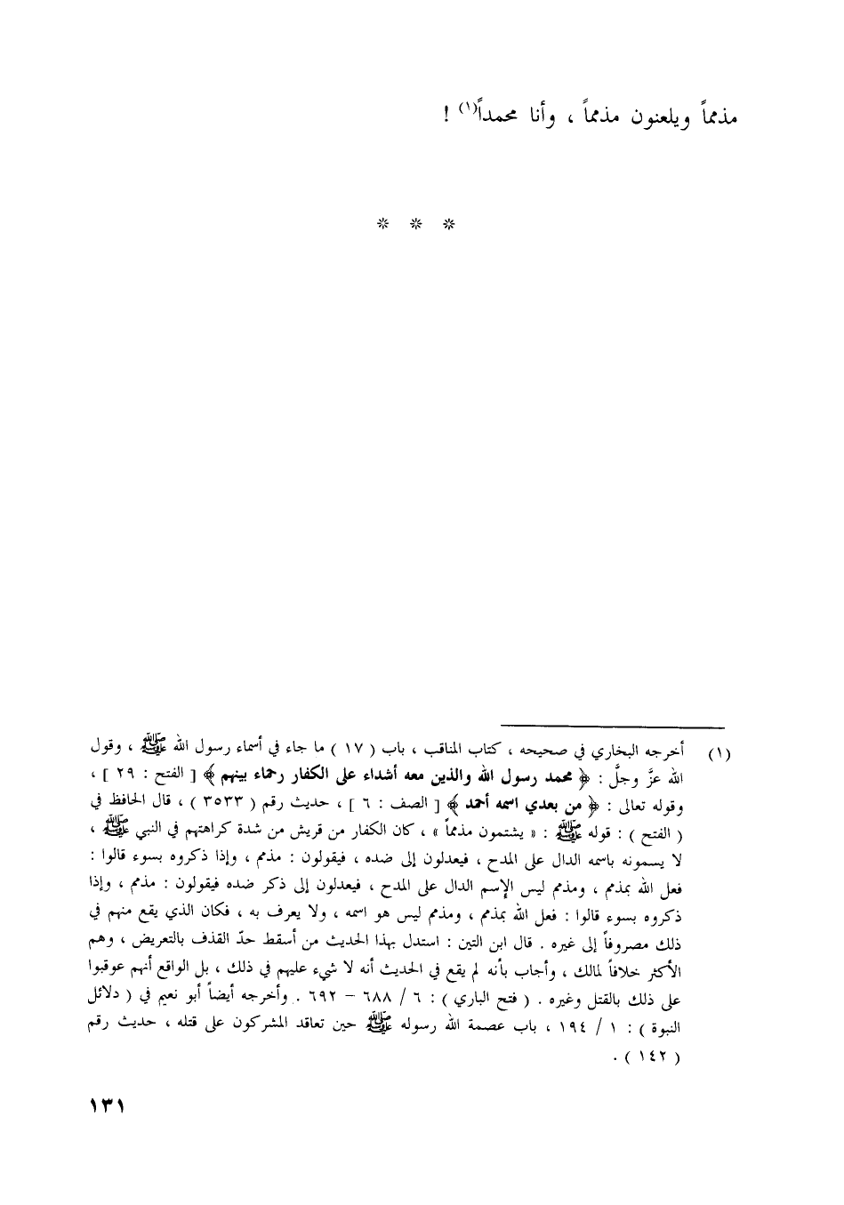 فعل اللَّه بمذمم، ومذمم ليس الاسم الدال على المدح، فيعدلون إلى ذكر ضده فيقولون: مذمم، وإذا ذكروه بسوء قالوا: فعل اللَّه بمذمم، ومذمم ليس هو اسمه، ولا يعرف به، فكان الّذي يقع منهم في ذلك مصروفا إلى غيره. قال ابن التين: استدل بهذا الحديث من أسقط حدّ القذف بالتعريض، وهم الأكثر خلافا لمالك، وأجاب بأنه لم يقع في الحديث أنه لا شيء عليهم في ذلك، بل الواقع أنهم عوقبوا على ذلك بالقتل وغيره. (فتح الباري) : 6/ 688- 692. وأخرجه أيضا أبو نعيم في (دلائل النبوة) : 1/ 194، باب عصمة اللَّه رسوله اللَّه صلّى اللَّه عليه وسلم حين تقاعد المشركون على قتله، حديث رقم (142) .