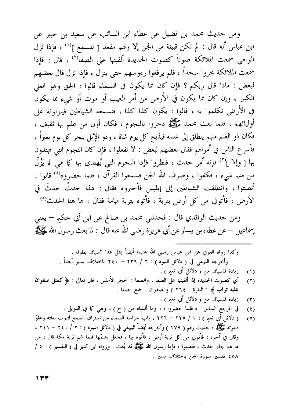 [ (5) ] (دلائل أبي نعيم) : 1/ 225- 226، باب حراسة السماء من استراق السمع لثبوت بعثته وعلوّ دعوته صلّى اللَّه عليه وسلم، حديث رقم (177) وأخرجه أيضا البيهقي في (دلائل النبوة) : 2/ 240- 241، وقال في آخره: فأتوني من كل تربة أرض، فأتوه بها، فجعل يشمّها فلما شم تربة مكة قال: من هاهنا جاء الحدث، فنصتوا، فإذا رسول اللَّه صلّى اللَّه عليه وسلم قد بعث. ورواه ابن كثير في (التفسير) : 4/ 458 تفسير سورة الجن باختلاف يسير.