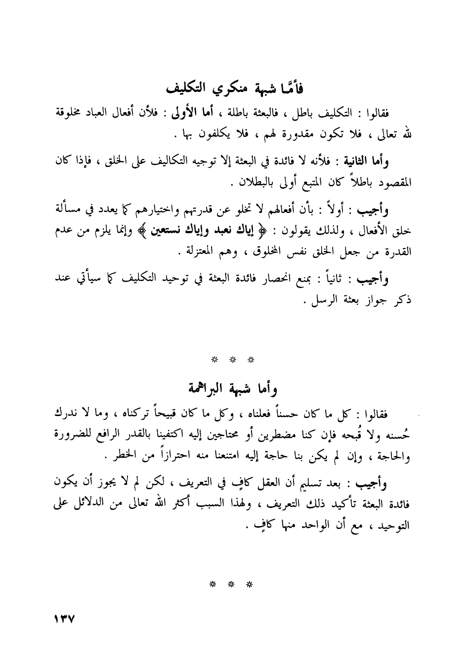 وأجيب: ثانيا: بمنع انحصار فائدة البعثة في توحيد التكليف كما سيأتي عند ذكر جواز بعثة الرسل.