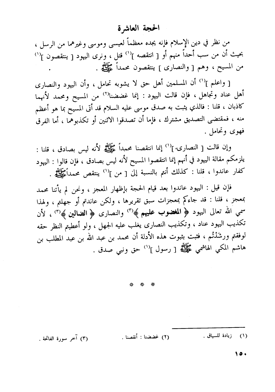 فإن قيل: اليهود عاندوا بعد قيام الحجة بإظهار المعجز، ونحن لم يأتنا محمد بمعجز، قلنا: قد جاءكم بمعجزات سبق تقريرها، ولكن عاندتم أو جهلتم، ولهذا سمي اللَّه تعالى اليهود الْمَغْضُوبِ عَلَيْهِمْ [ (3) ] والنصارى الضالين [ (3) ] ، لأن تكذيب اليهود عناد، وتكذيب النصارى يغلب عليه الجهل، ولو أعطيتم النظر حقه لوفقتم ورشدتم، فثبت بثبوت هذه الأدلة أن محمد بن عبد اللَّه بن عبد المطلب بن هاشم المكيّ الهاشمي صلّى اللَّه عليه وسلم [رسول] [ (1) ] حق ونبي صدق.